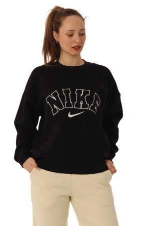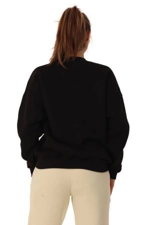 Kadın Bisiklet Yaka Nakış Desenli İçi Pamuklu Oversize Kalıp Sweatshirt Siyah