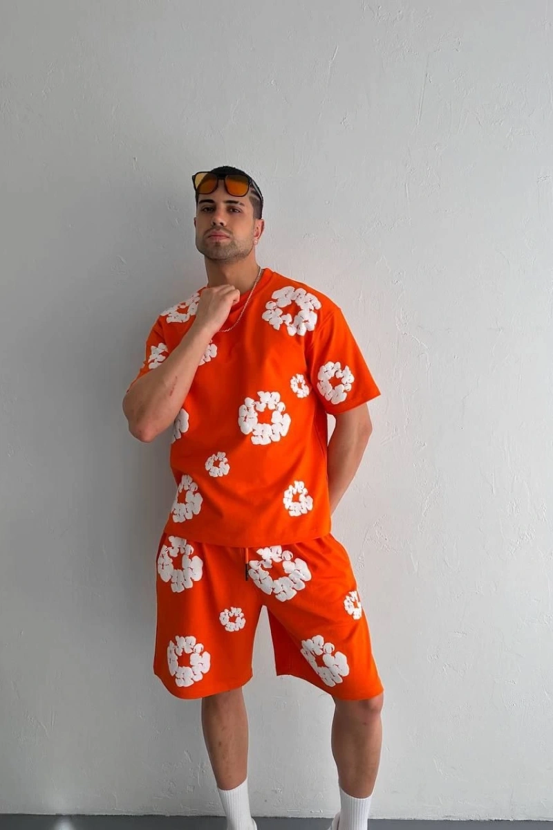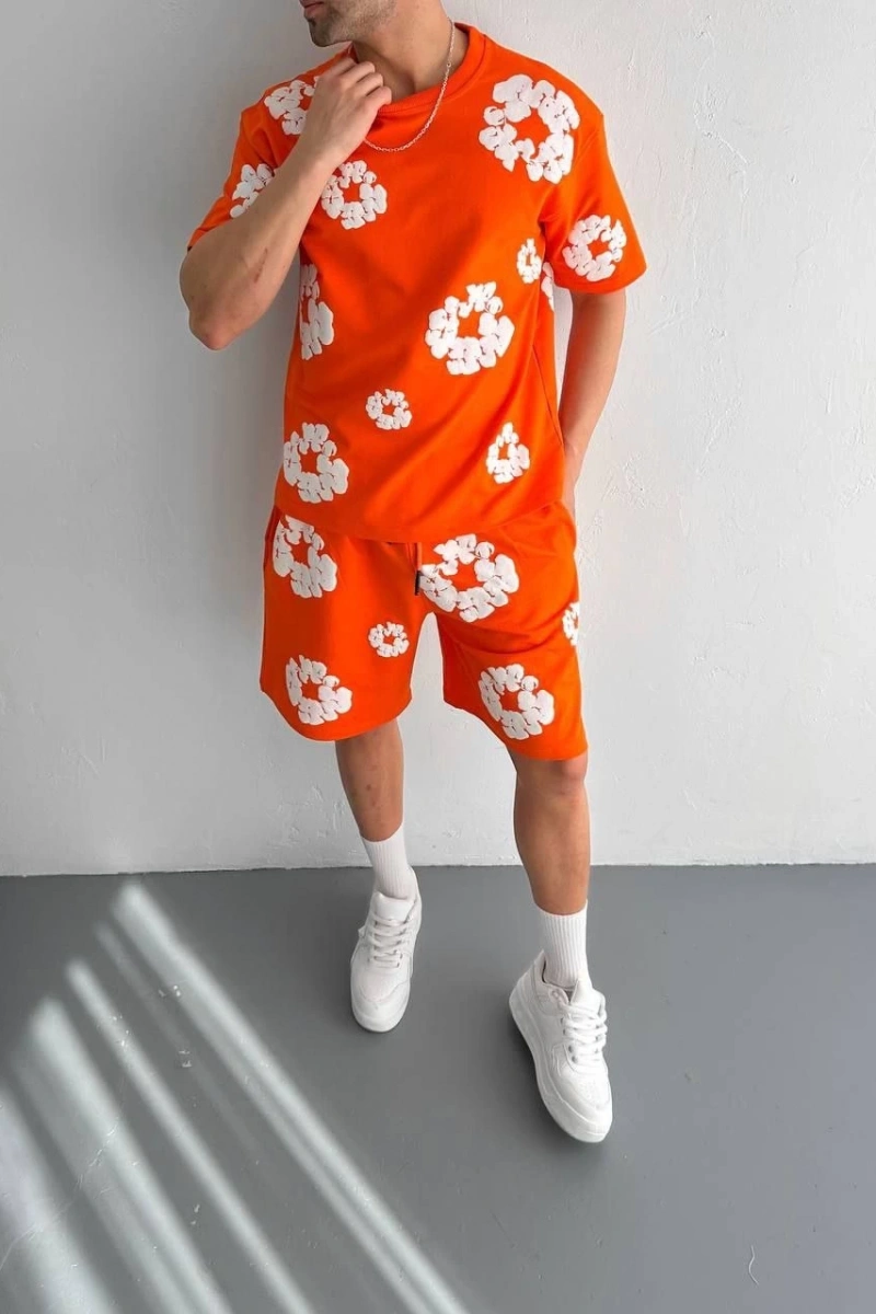 İki İplik Kumaş Baskılı T-shirt Şortlu Takım- Turuncu