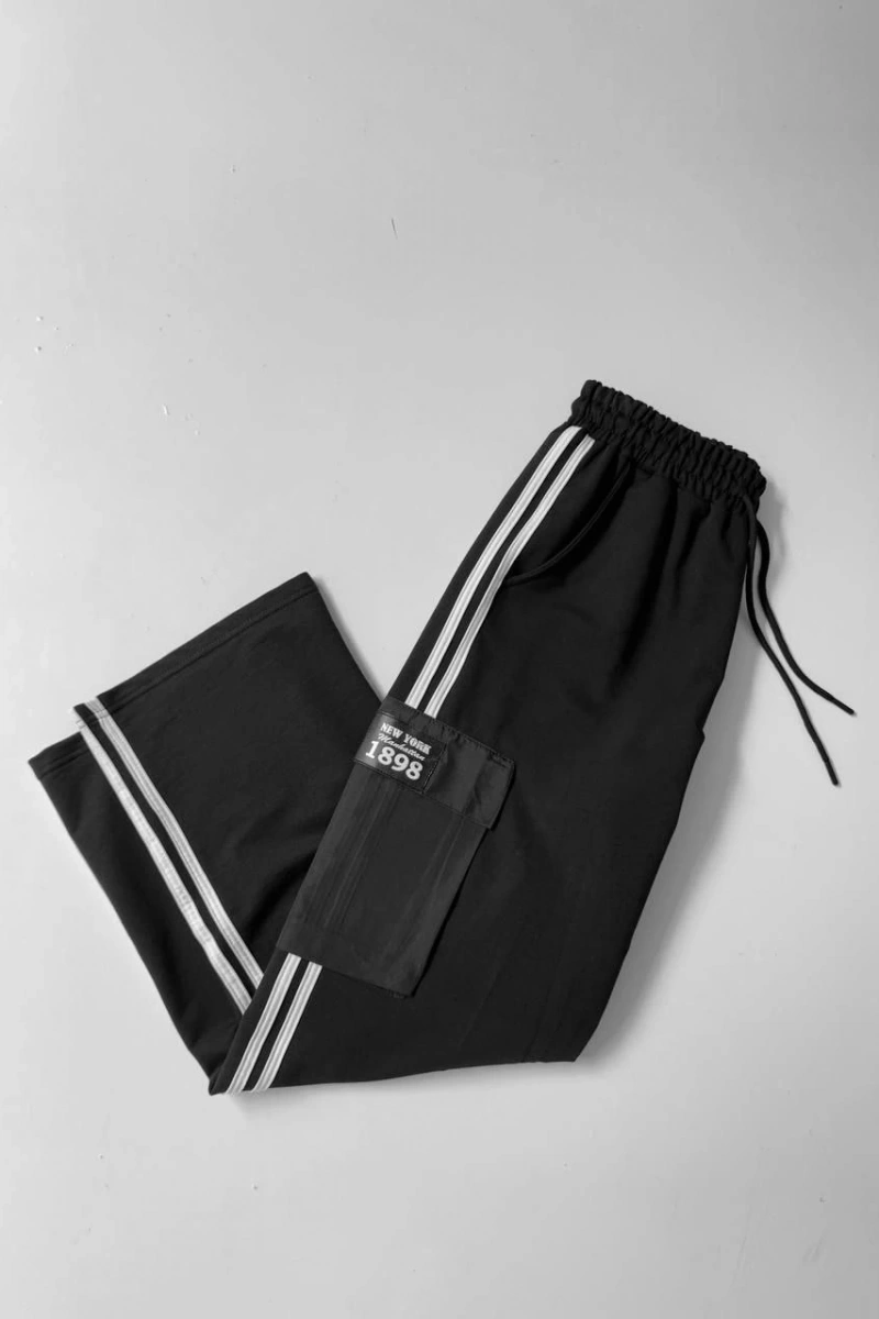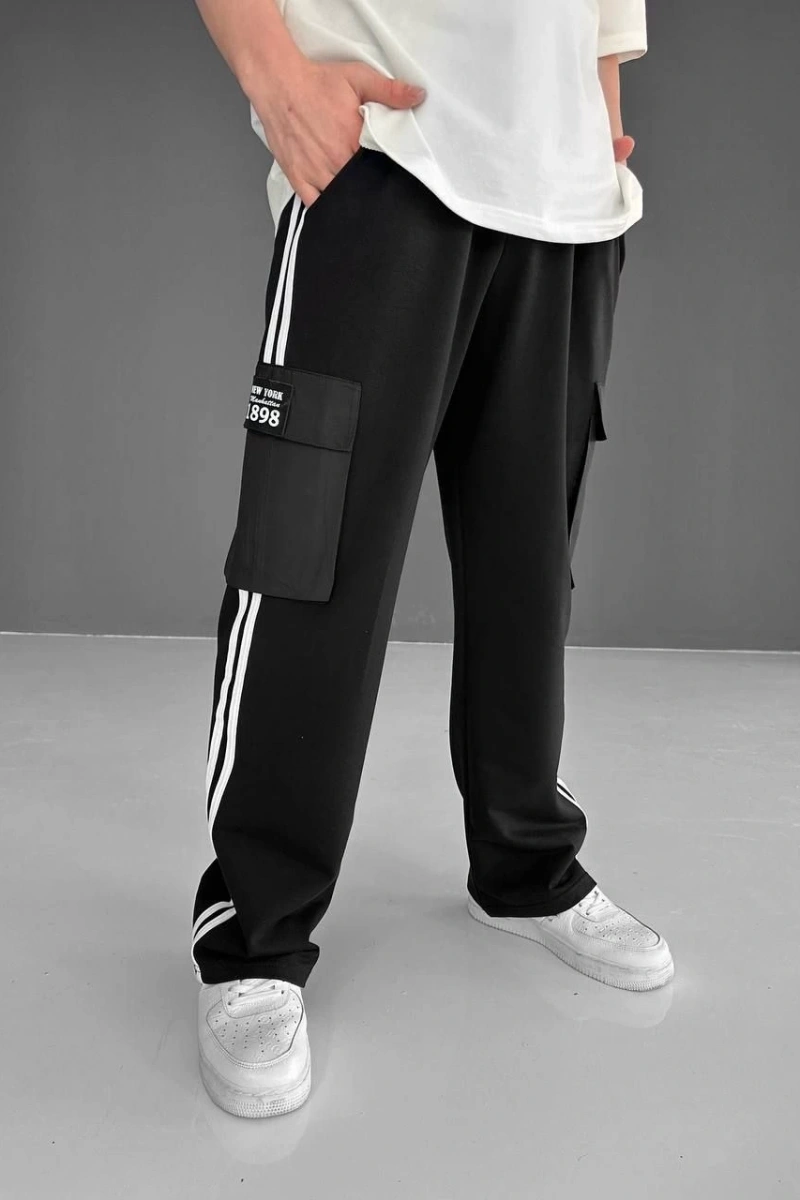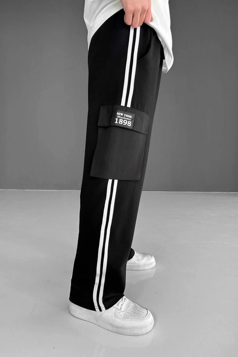 İki İplik Kumaş Kargo Cepli Şeritli Alt Esofman - Siyah