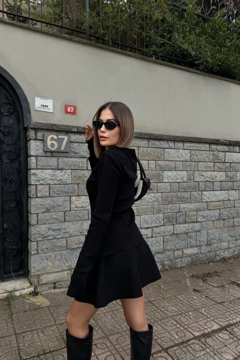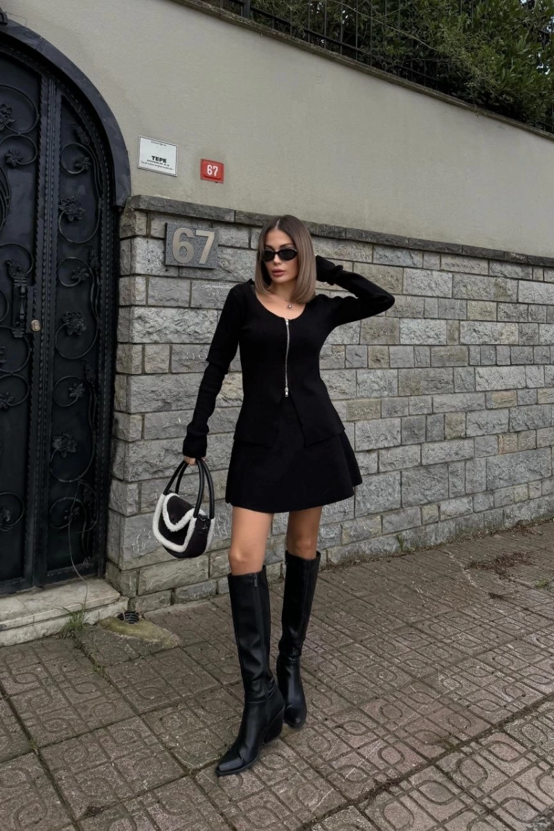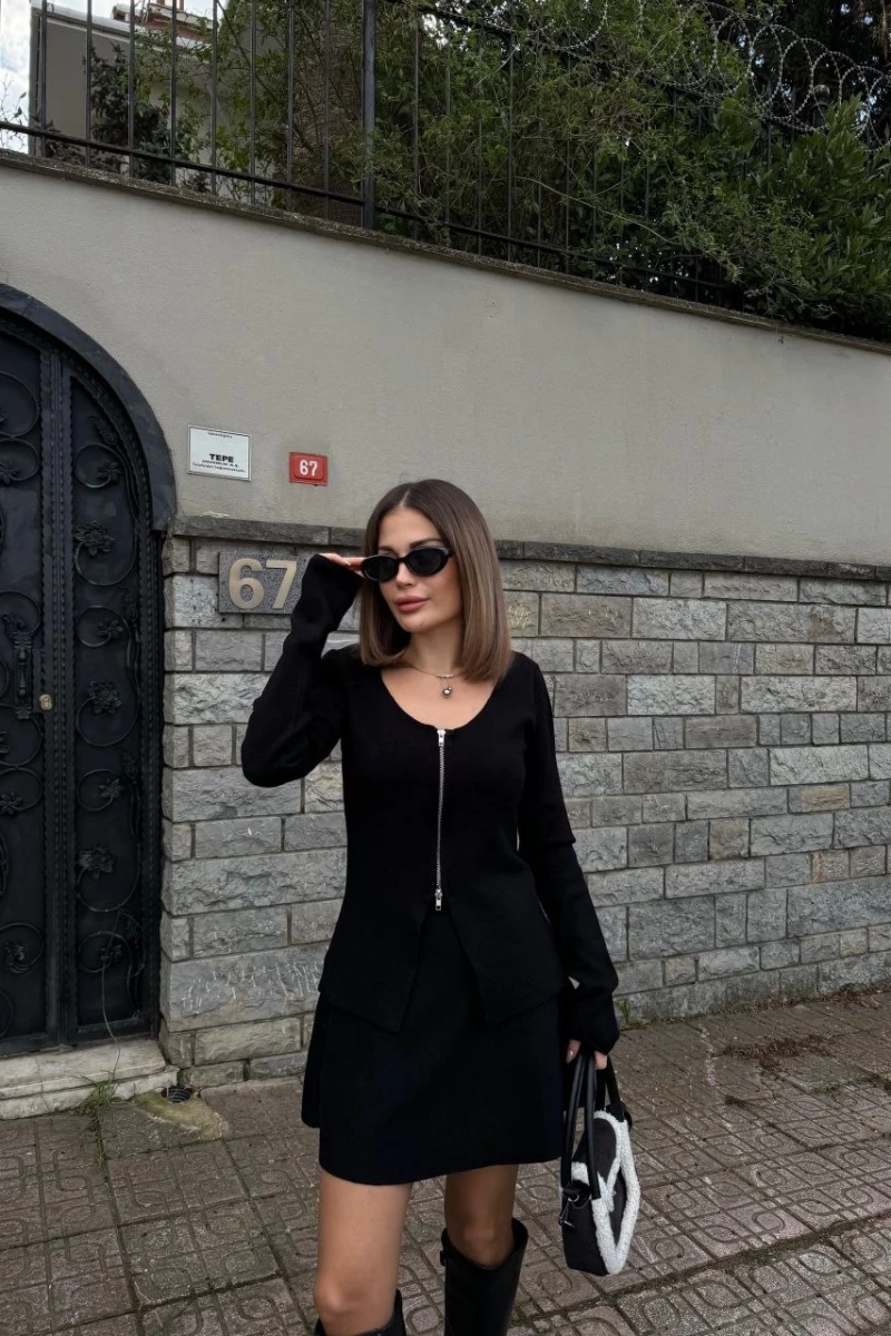İkili Fermuarlı Hırkalı Etekli Takım - Siyah