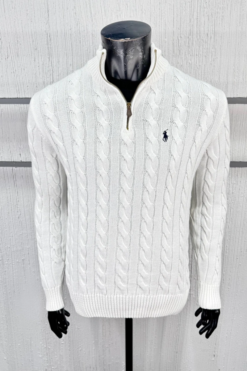 Kablo Örgülü Pamuklu Yarım Fermuarlı Kazak Beyaz