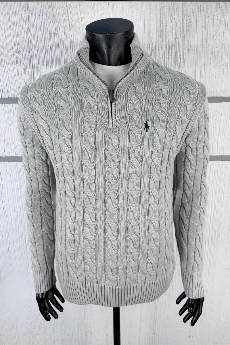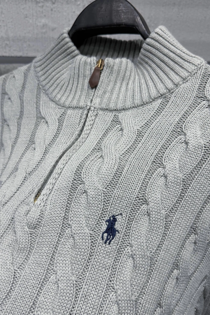 Kablo Örgülü Pamuklu Yarım Fermuarlı Kazak Gri