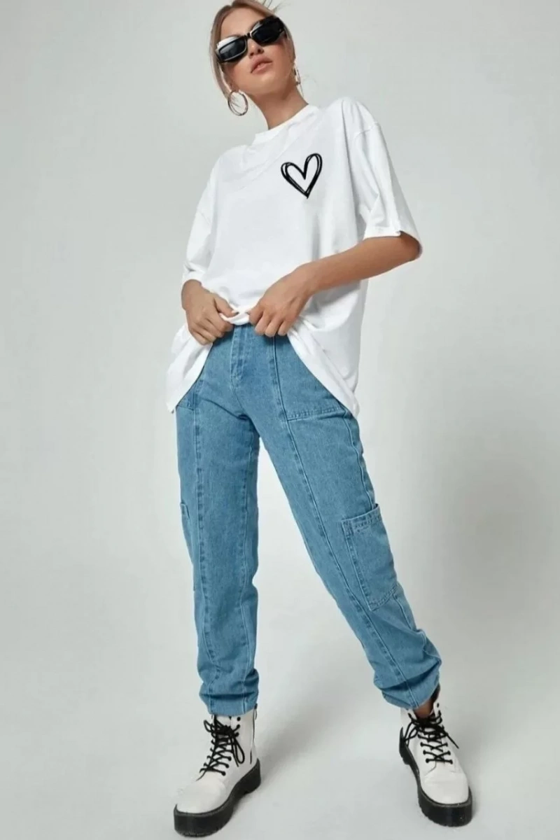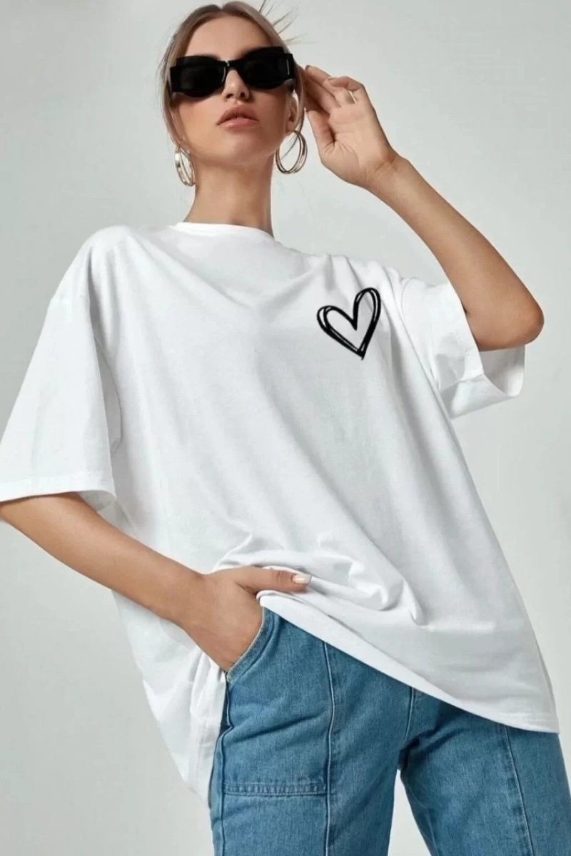 Kadın Bisiklet Yaka Baskılı Oversize T-Shirt - Beyaz