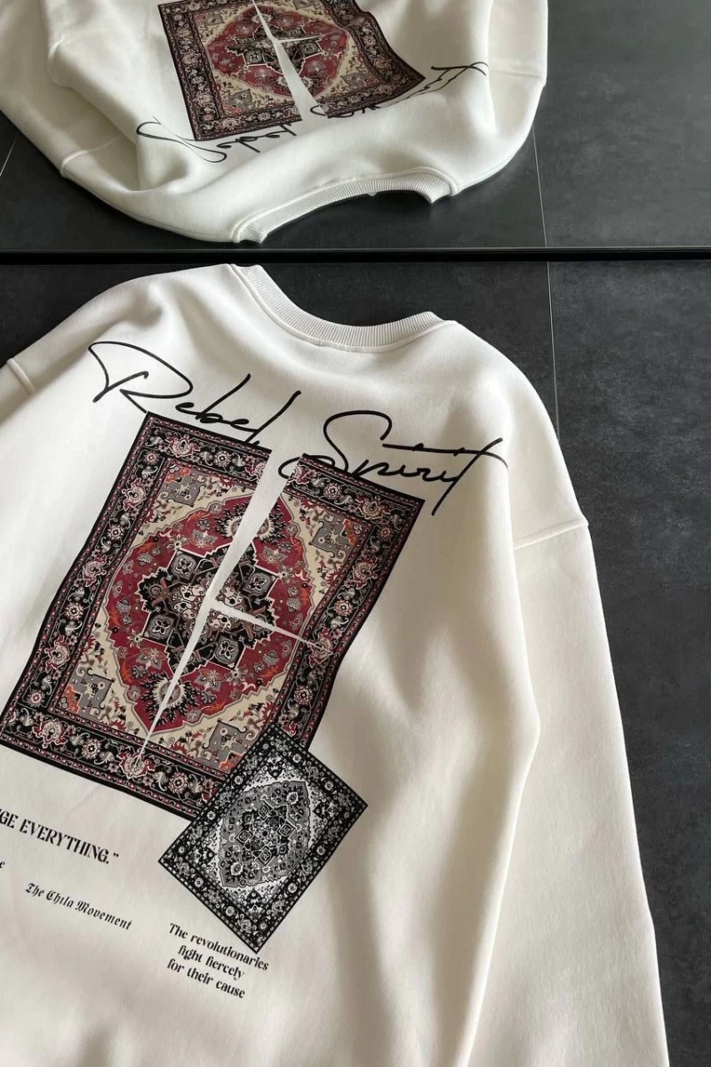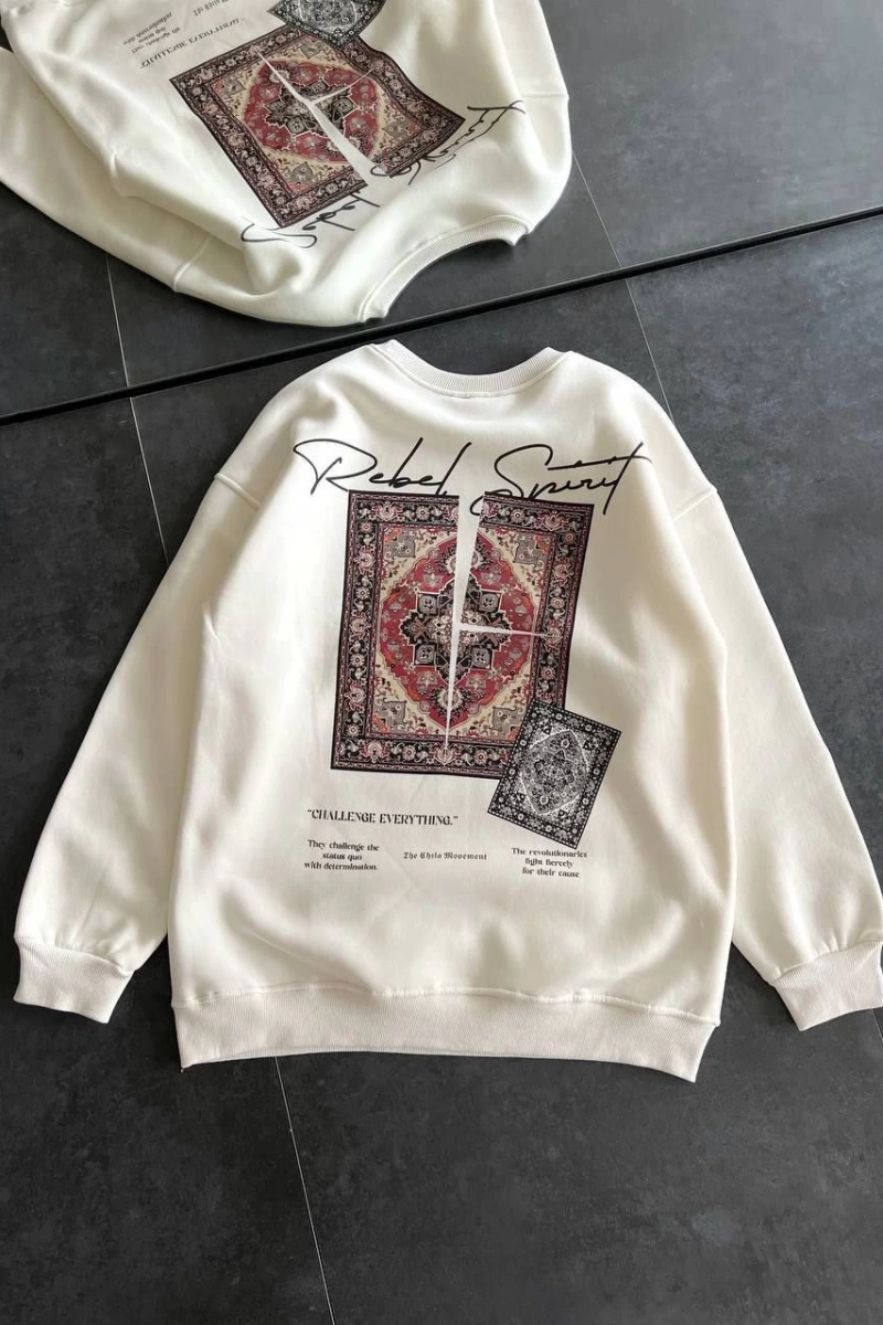 Kadın Bisiklet Yaka Baskılı SweatShirt - Beyaz