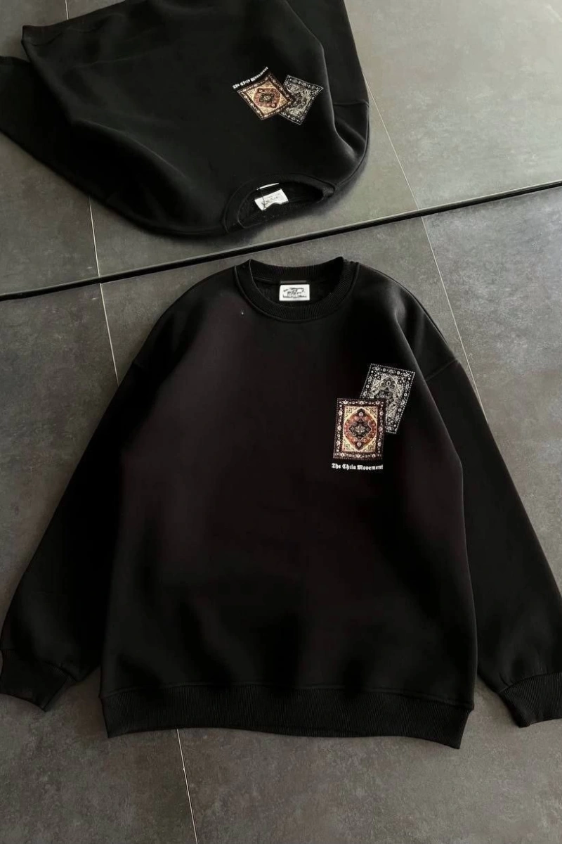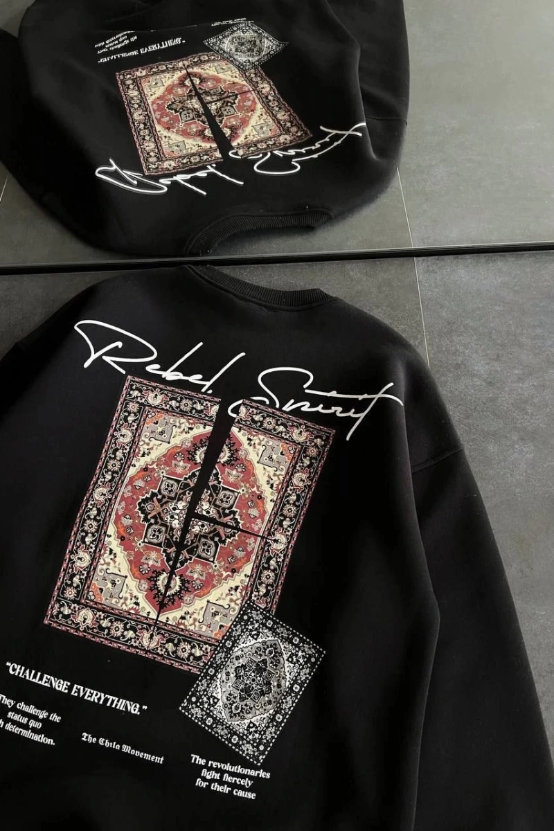 Kadın Bisiklet Yaka Baskılı SweatShirt - Siyah
