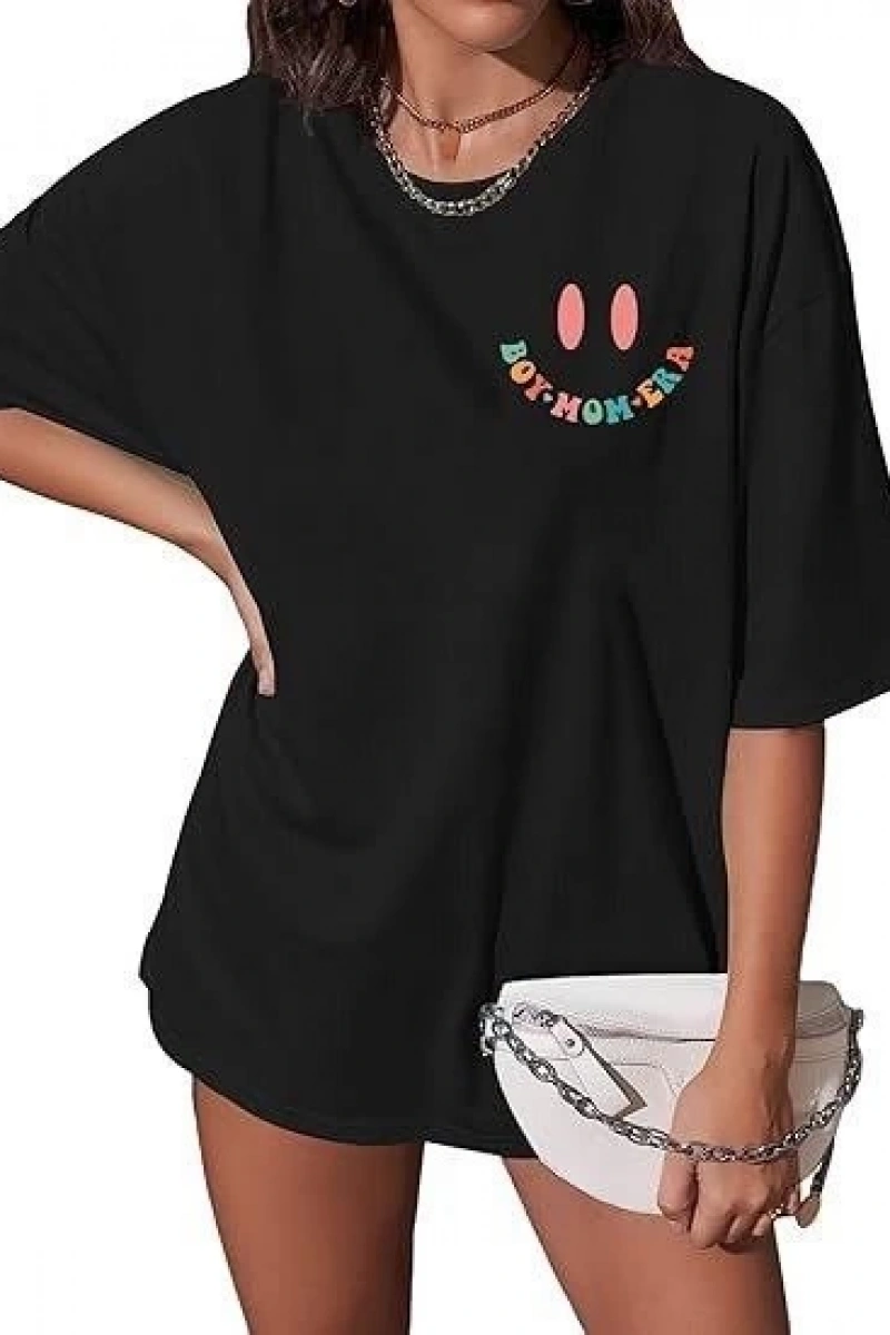 Kadın Bisiklet Yaka Kısa Kol Baskılı T-shirt - Siyah