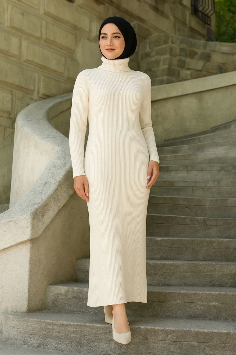 Kadın Tesettür Triko Elbise – Boğazlı Uzun Fitilli Dokuma, Esnek Tam Kalıp, 130 cm Midi Boy, Bahar & Kış Şık Rahat Stil - Beyaz