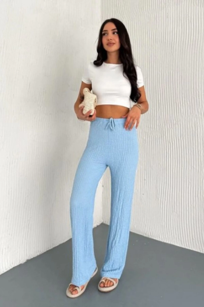 Kadın Bol Paça Bubble Gufre Kumaş Cepli Beli Lastikli Rahat Kalıp Pantolon Mavi