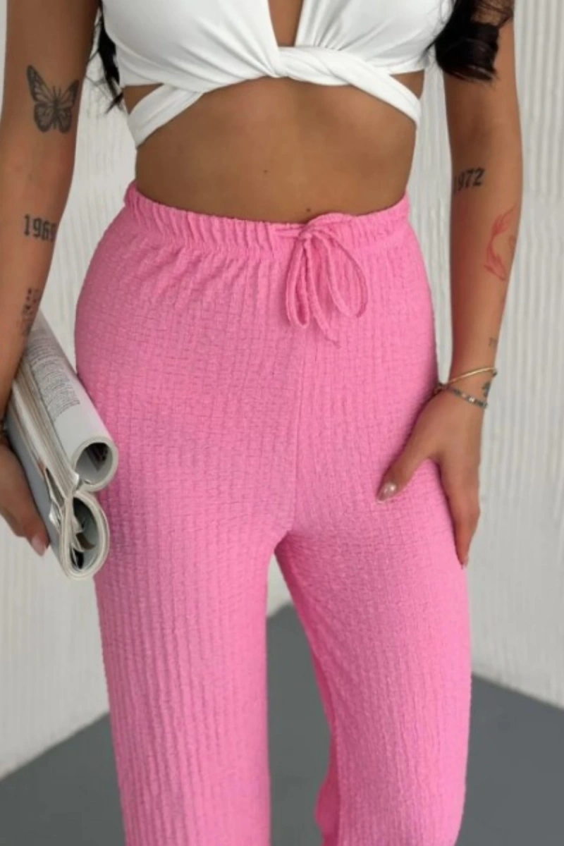 Kadın Bol Paça Bubble Gufre Kumaş Cepli Beli Lastikli Rahat Kalıp Pantolon Pembe
