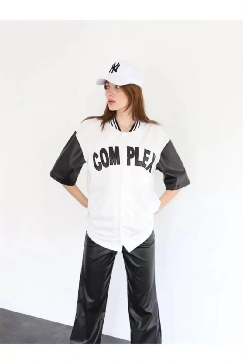 Kadın Complex Kolları Deri Kolej Oversize T-shirt - Beyaz