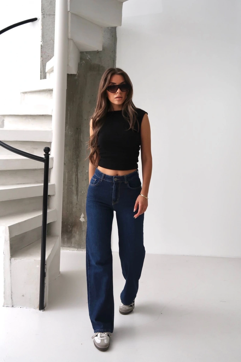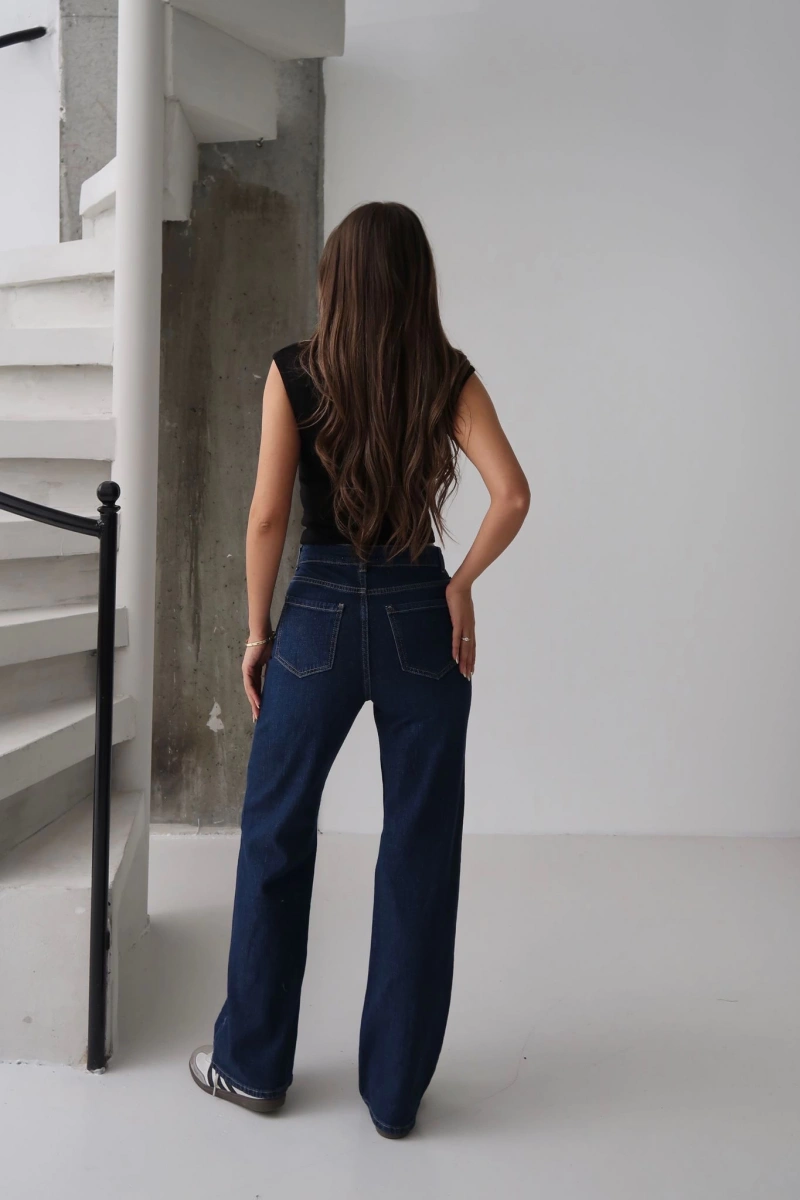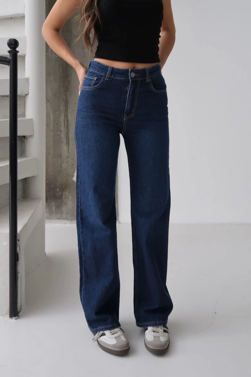 Yüksek kaliteli denim malzemesi ile üretilen Kadın Geniş Bol Paça Regular Fit Jean Kot Pantolon Lacivert, şıklığı ve rahatlığı bir arada sunar.