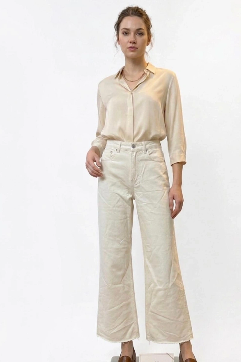 Kadın Geniş Paça Yüksek Bel Cepsiz Kot Pantolon - Ekru