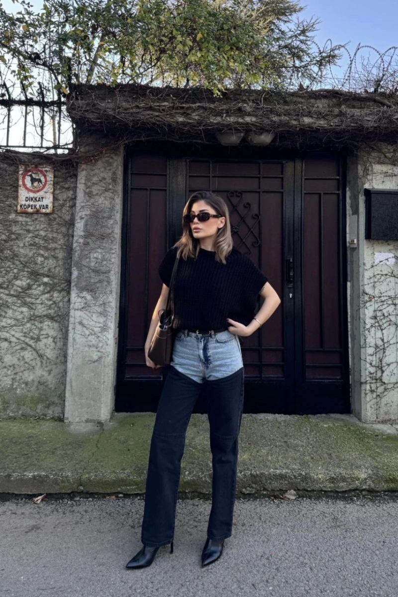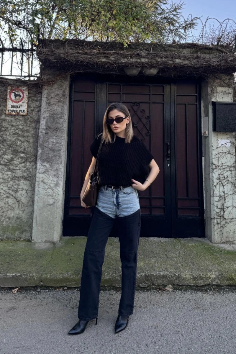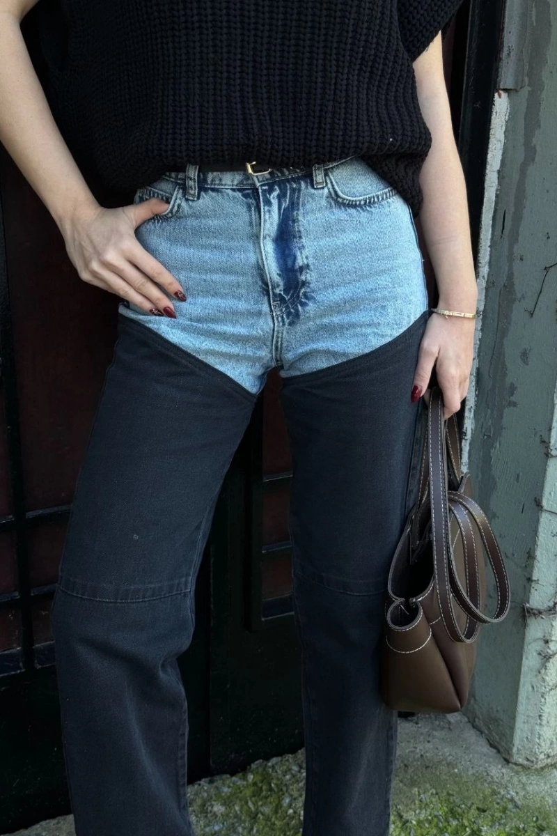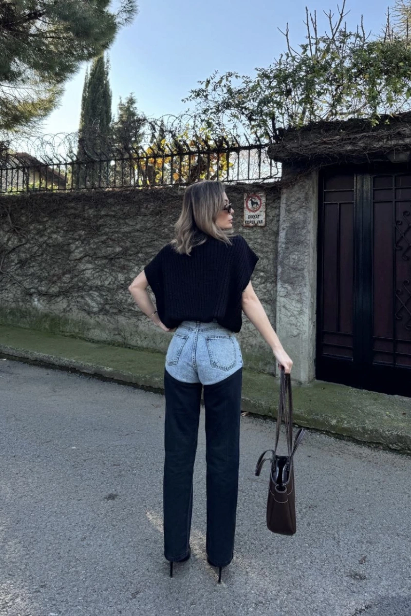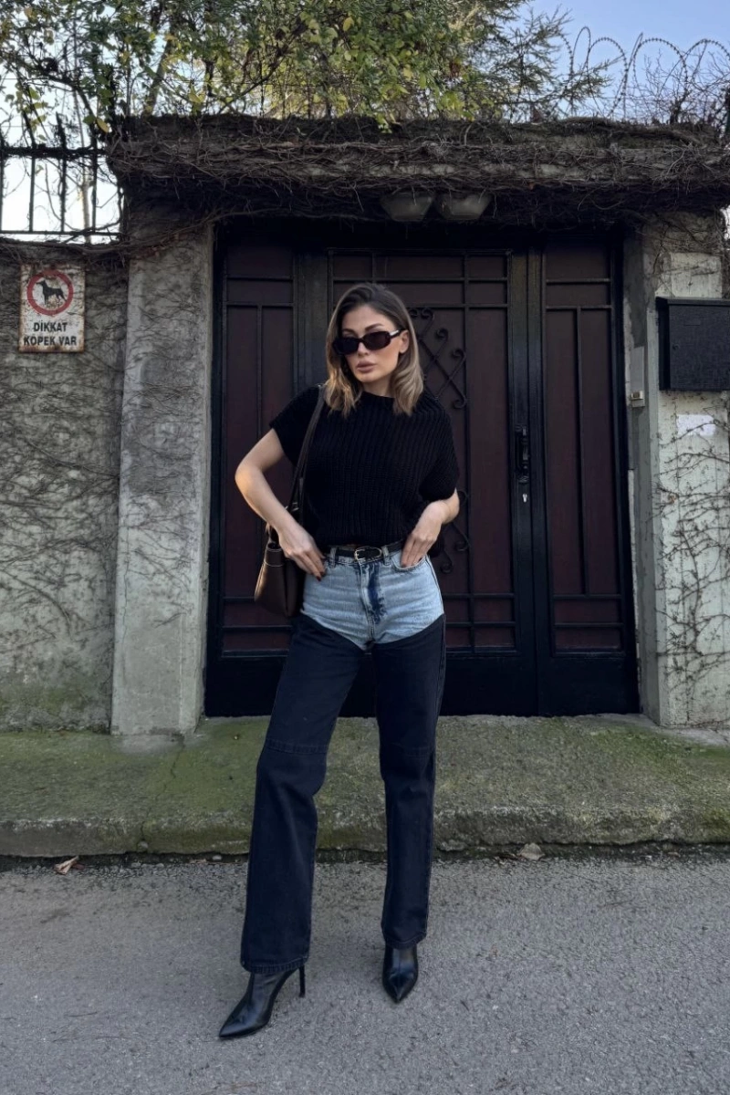 Kadın Jeans Kot Parçalı Palazzo Pantolon - Siyah
