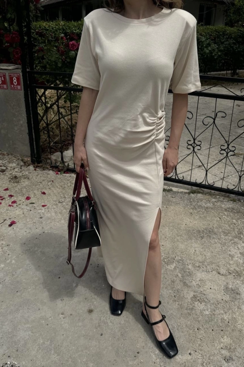 Kadın Kısa Kollu Uzun Yandan Yırtmaçlı Elbise - Bej