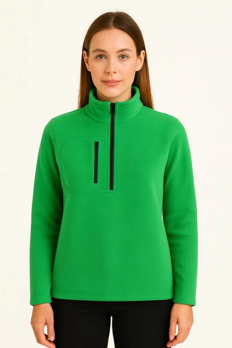 Kadın Polar Kazak – Dik Yaka, Yarım Fermuarlı, Fermuarlı Göğüs Cepli, Siyah Biyeli, Kışlık Rahat Regular Fit Günlük Model - Yeşil