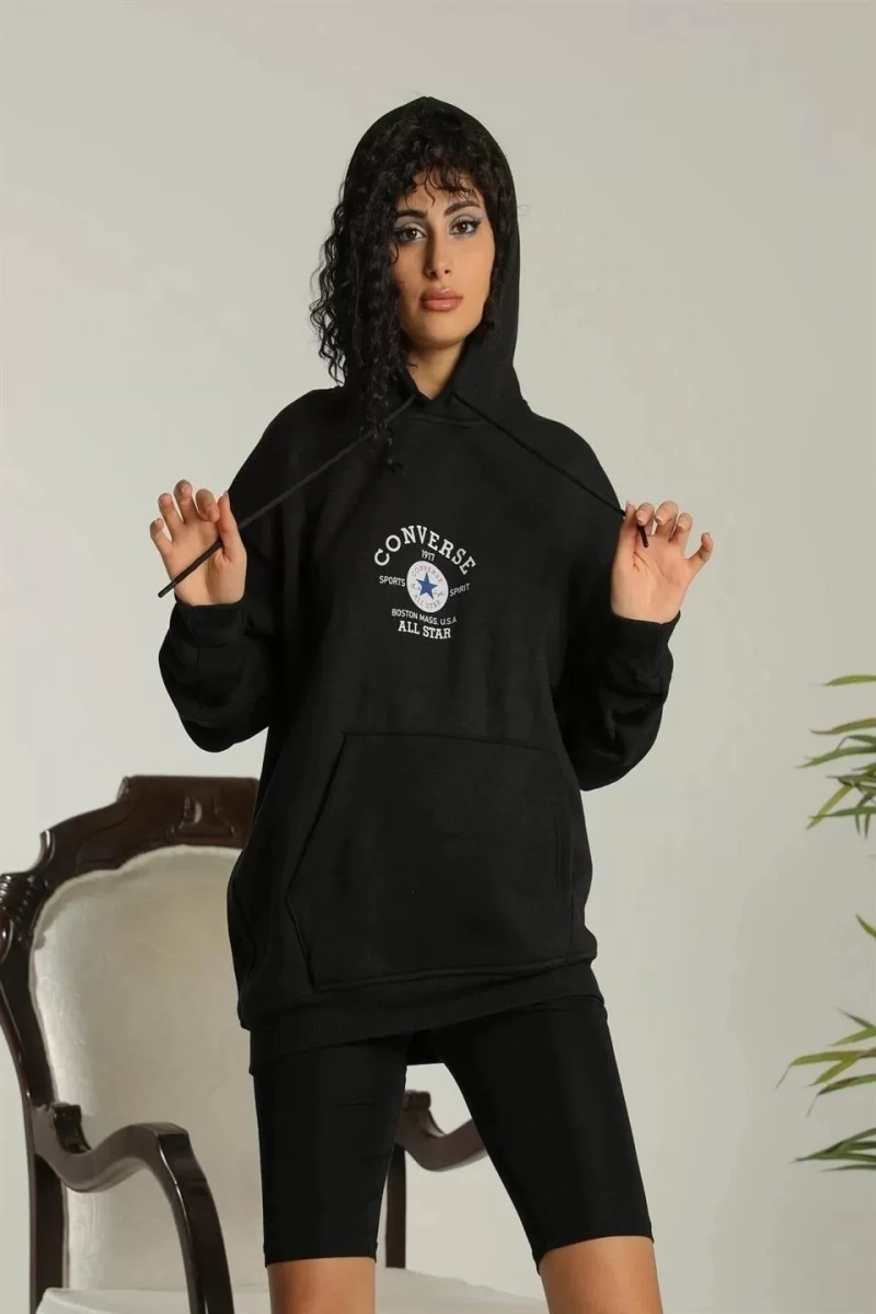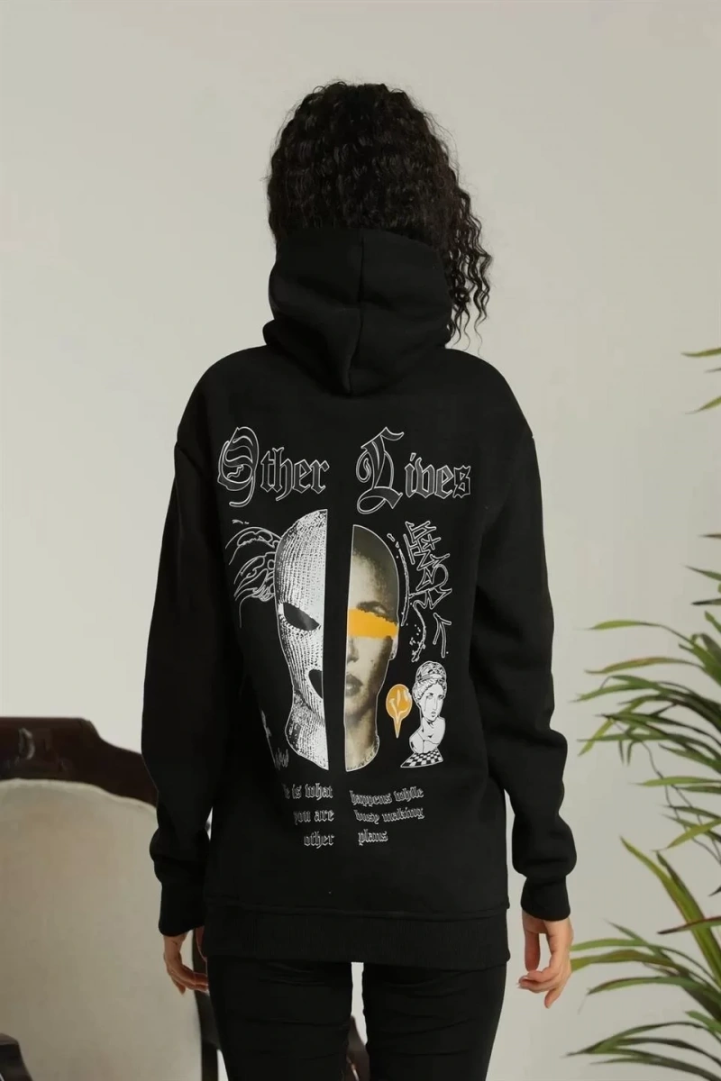 Kadın Kapşonlu Sweatshirt – Oversize Üç İplik Şardonlu Hoodie, “Other Lives” Ön & Arka Baskılı, Kanguru Cepli, Kışlık Rahat Günlük Stil - Siyah