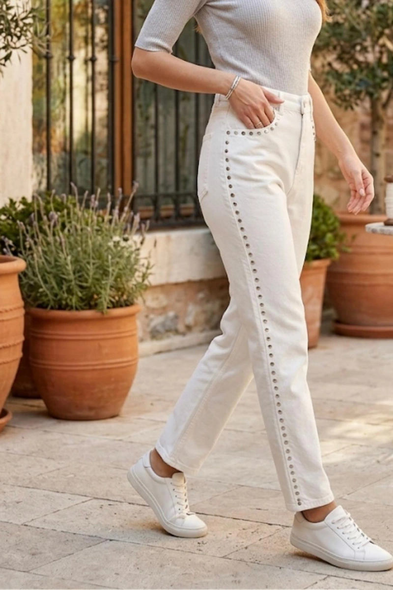 Kadın Taş Detaylı Kot Pantolon - Beyaz