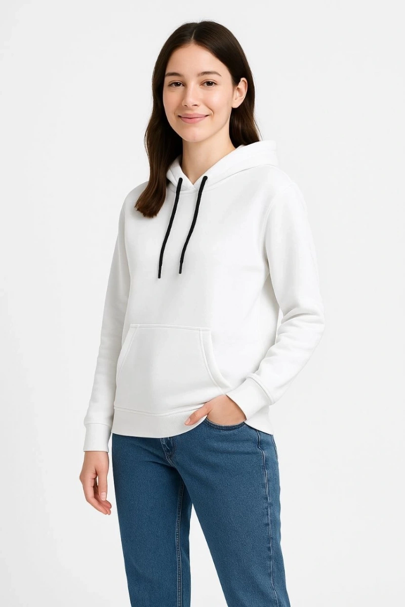 Kadın Üç İplik Kapüşonlu Kanguru Çepli SweatShirt hoodie - Beyaz