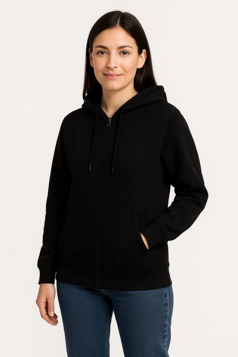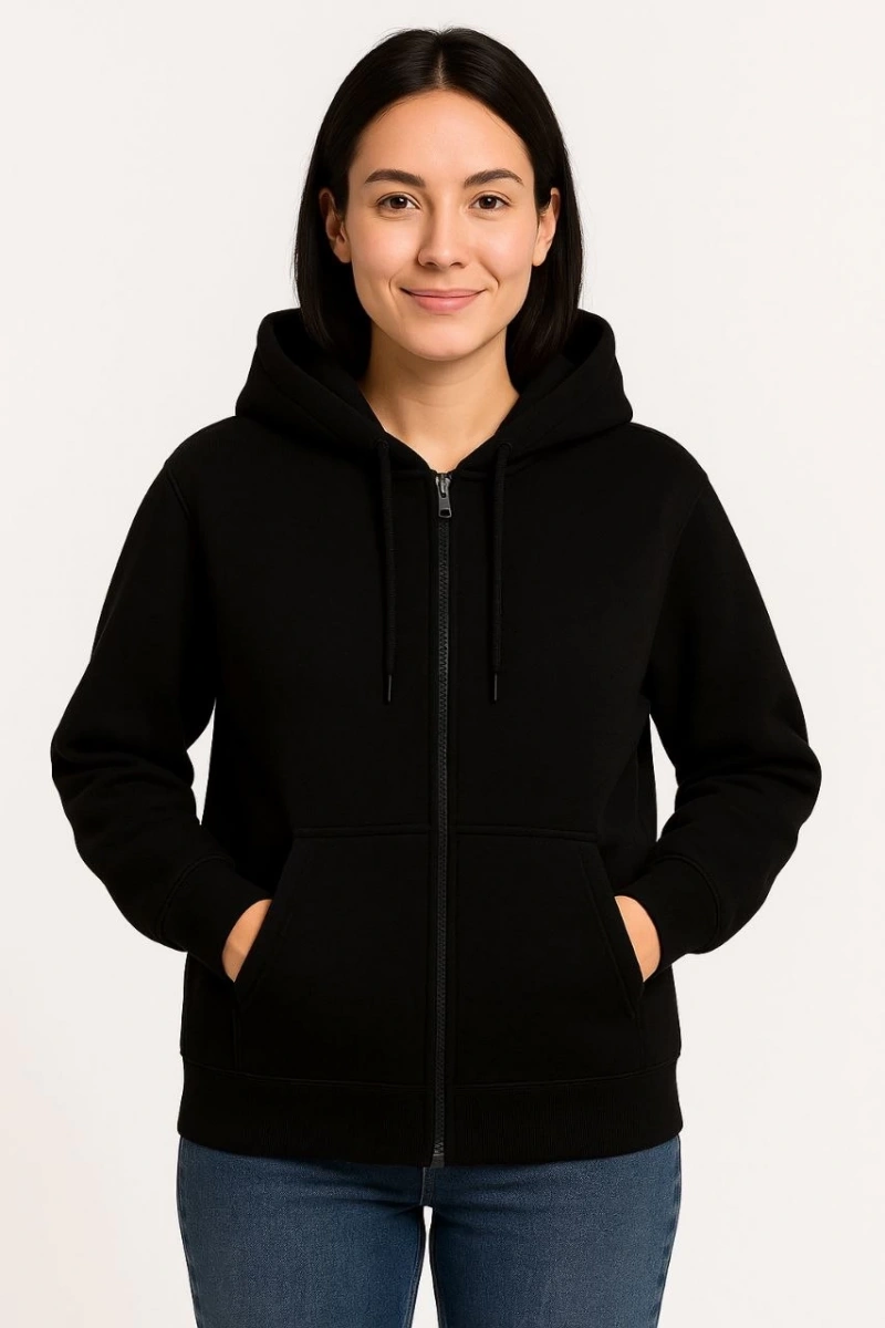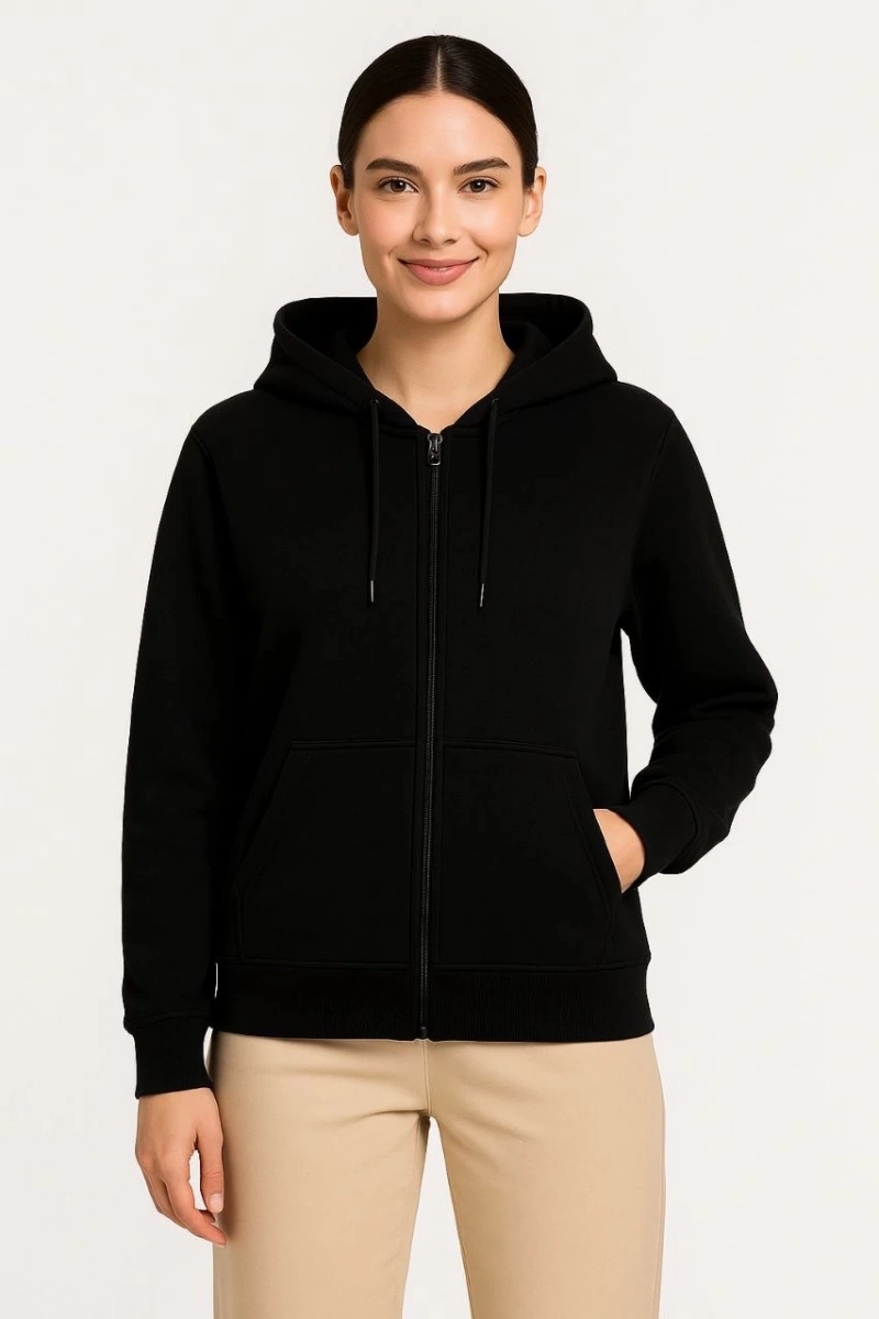 Kadın Üç İplik Kapüşonlu Tam Fermuarlı Kanguru Çepli SweatShirt Hoodie - Siyah
