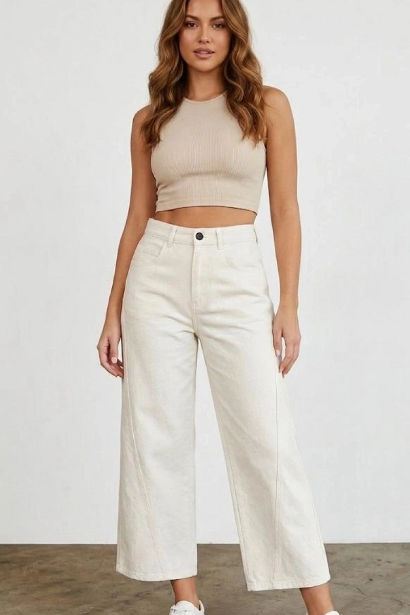 Kadın Yüksek bel Geniş Kesim Kot Pantolon -Kırık Beyaz