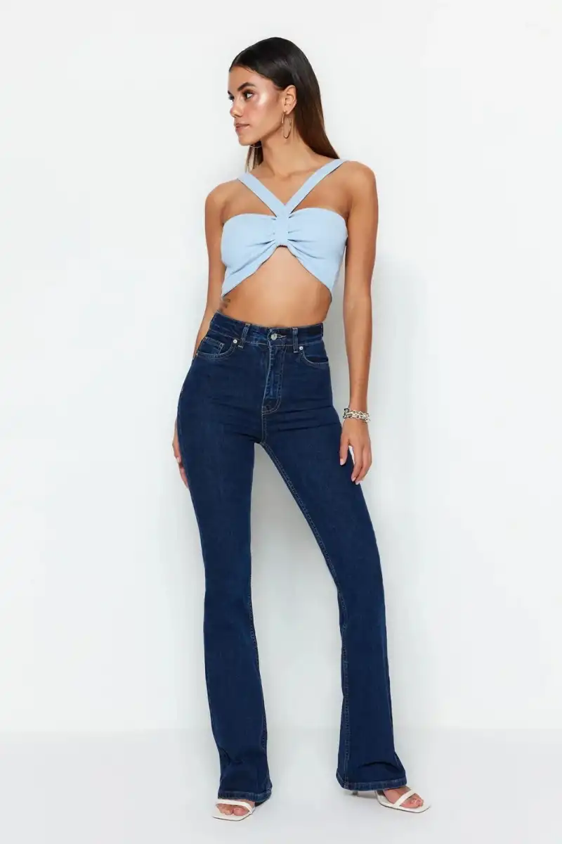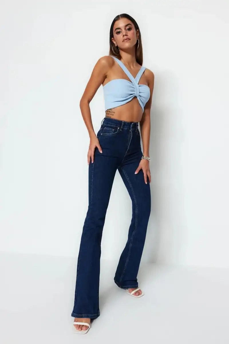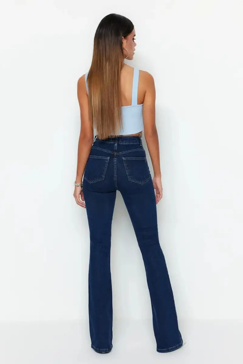 Kadın Yüksek Bel İspanyol Paça Slim Fit Jean Kot Pantolon Lacivert