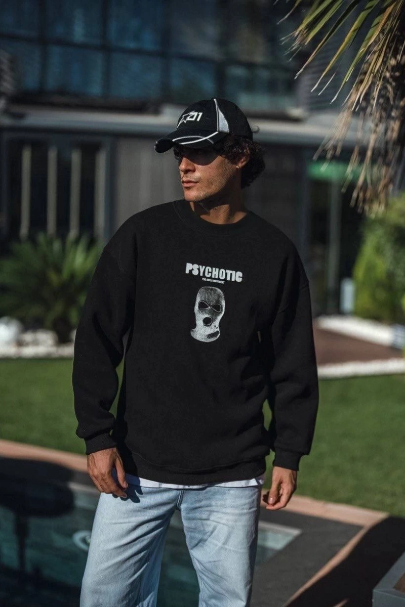 Kışlık Bisiklet Yaka Baskılı SweatShirt - Siyah