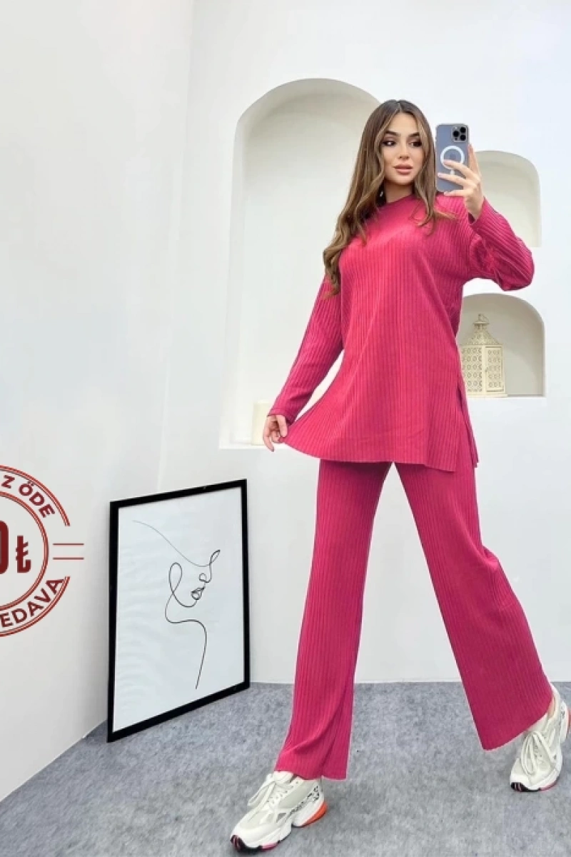 Yazlık Fitilli Triko Bol Paça İkili Takım Bluz - Pantolon Fuşya
