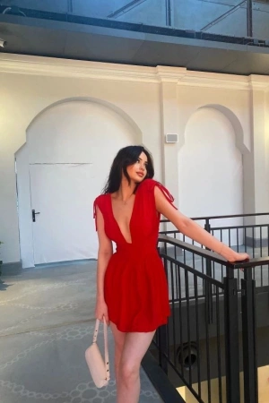 Omuzu ip Askılı Şortlu Elbise - Kırmızı