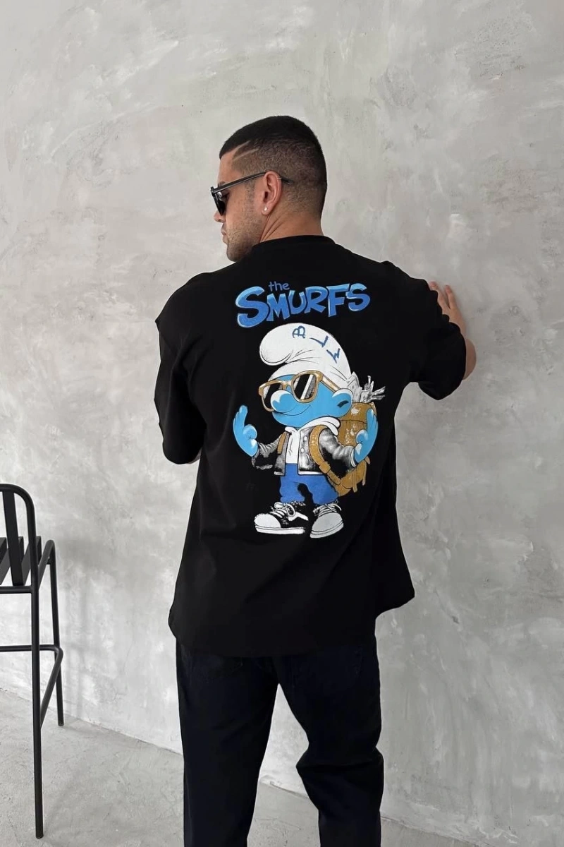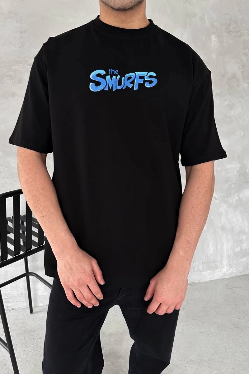 Ön ve Arka Baskılı Oversize Bisiklet Yaka T-shirt- Siyah