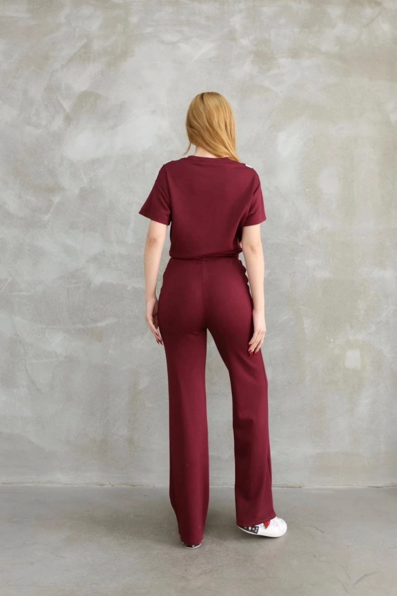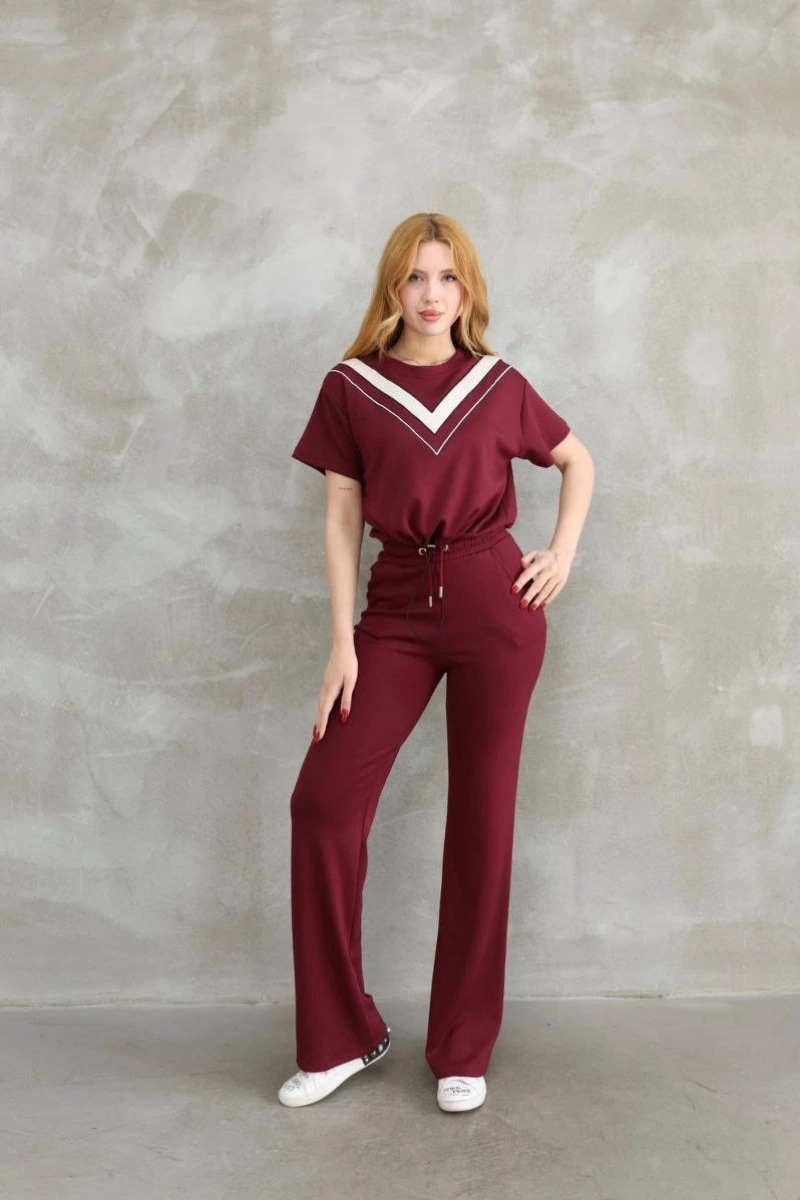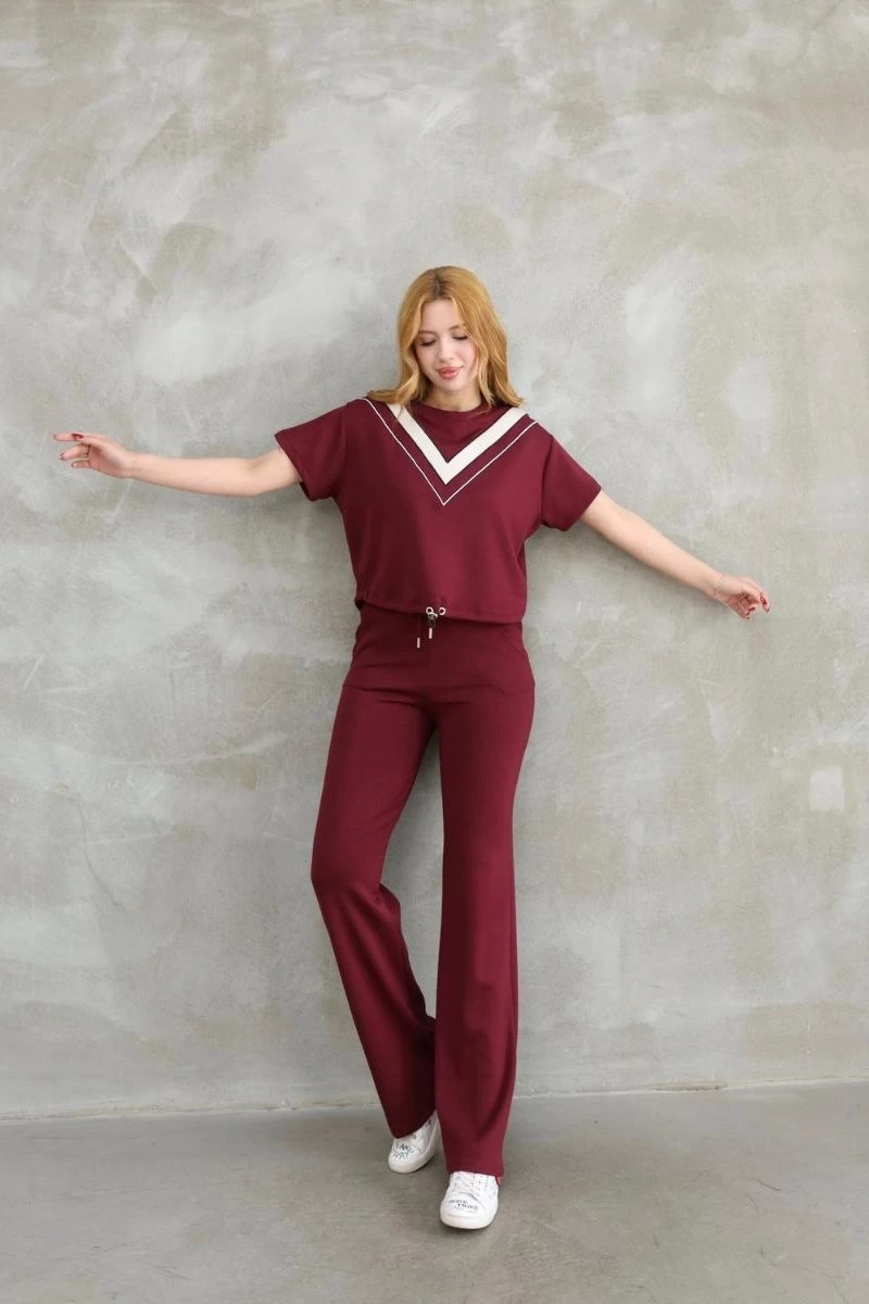 Osy Modal Yumuşak dokulu Kumaş Bisiklet Yaka Parçalı detaylı Kısa Kollu Takım - Bordo