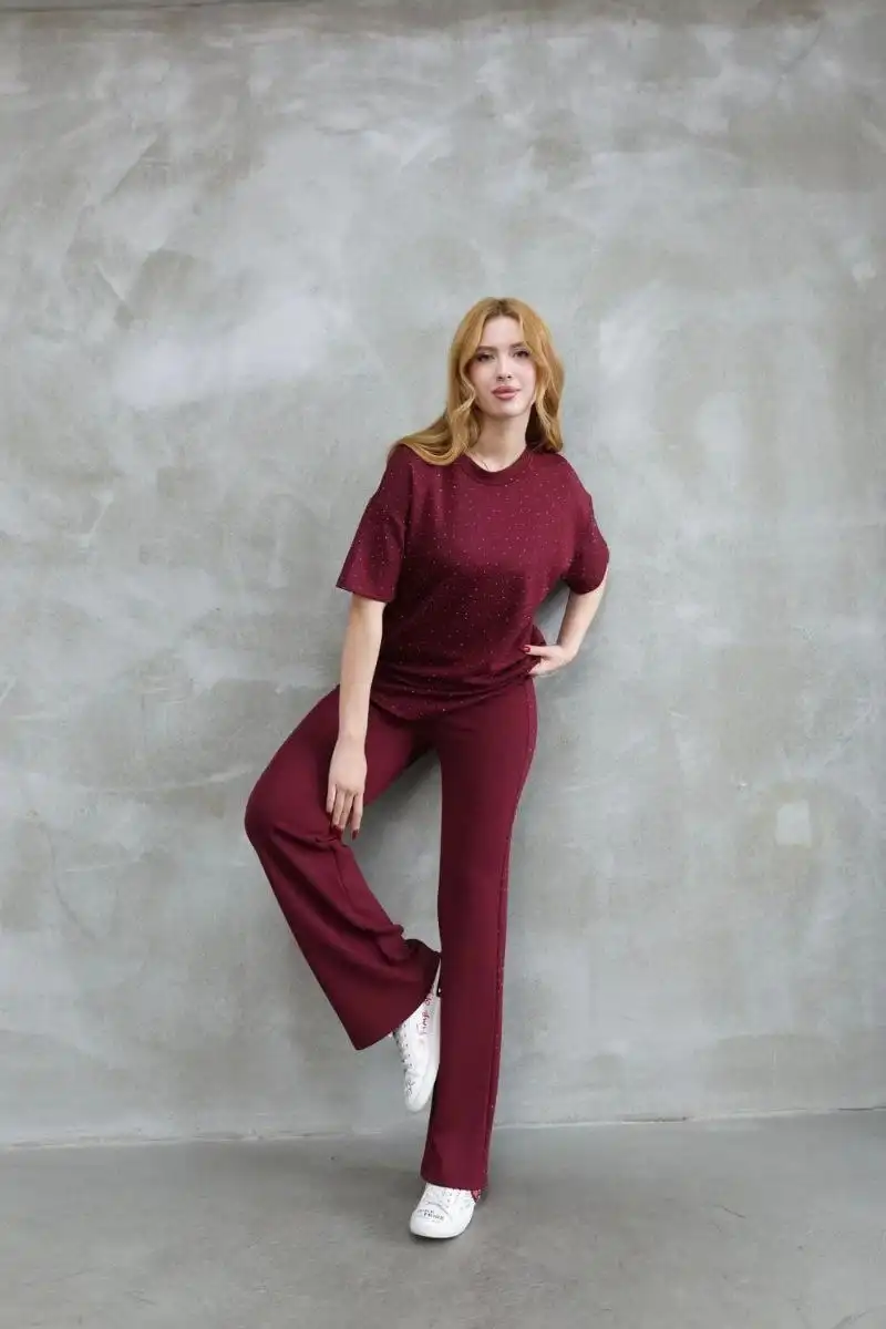 Osy Modal Yumuşak dokulu Kumaş Bisiklet Yaka Taş detaylı Kısa Kollu Takım - Bordo