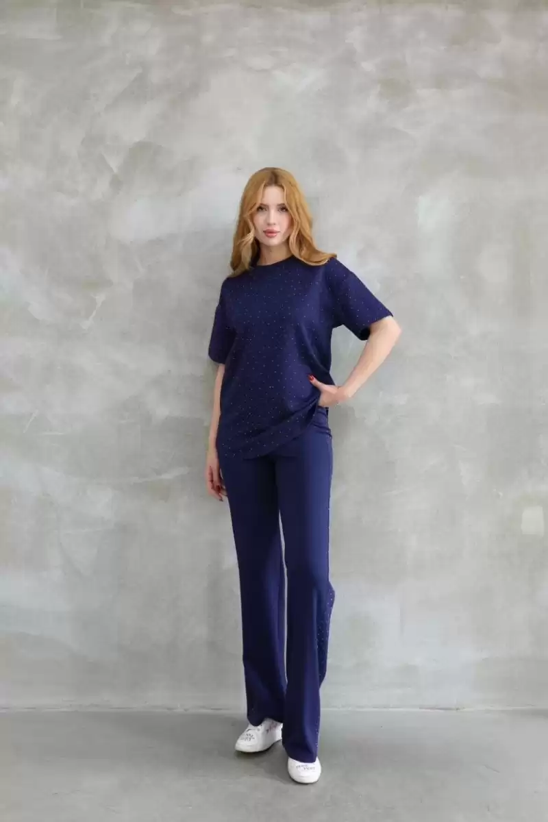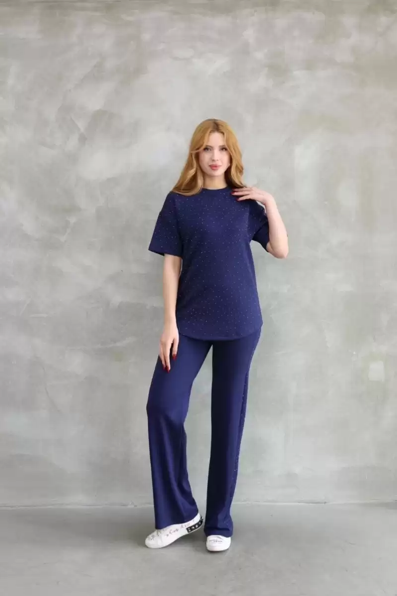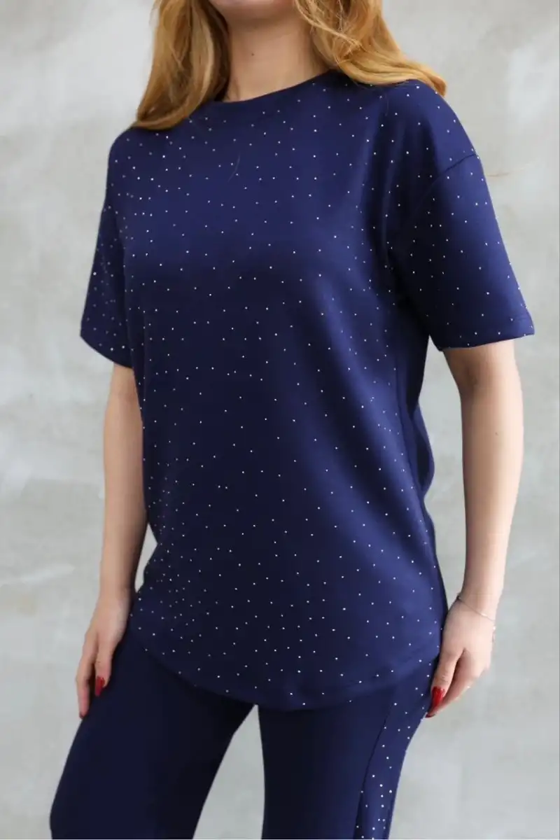 Osy Modal Yumuşak dokulu Kumaş Bisiklet Yaka Taş detaylı Kısa Kollu Takım - Lacivert