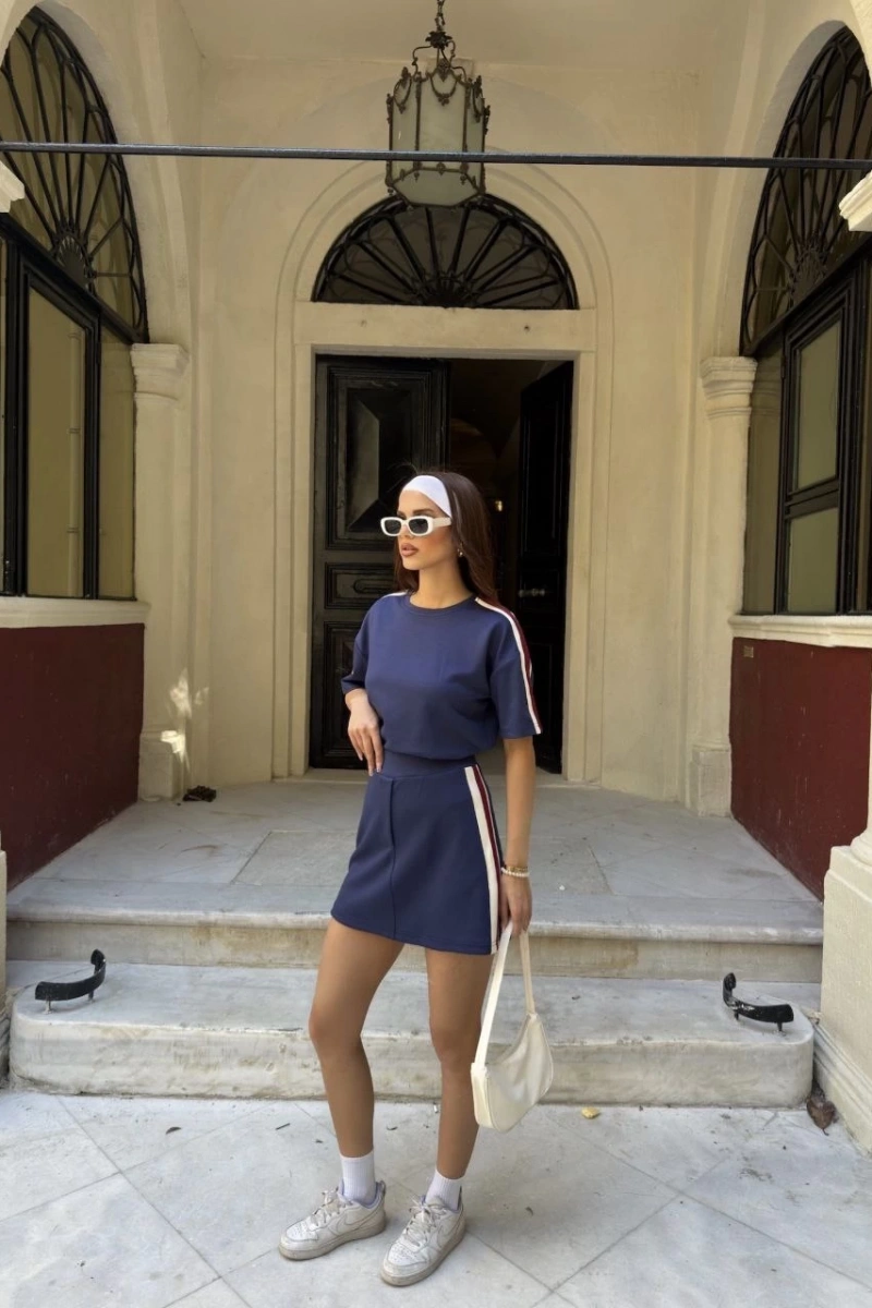 Osy Modal yumuşak dokulu Kumaş Kadın Parçalı Bisiklet Yaka T-shirt Mini Şortlu Etek İkili Takım -Lacivert