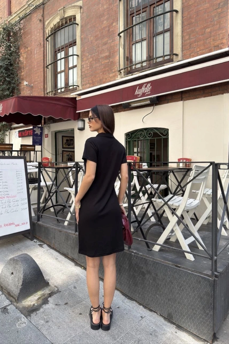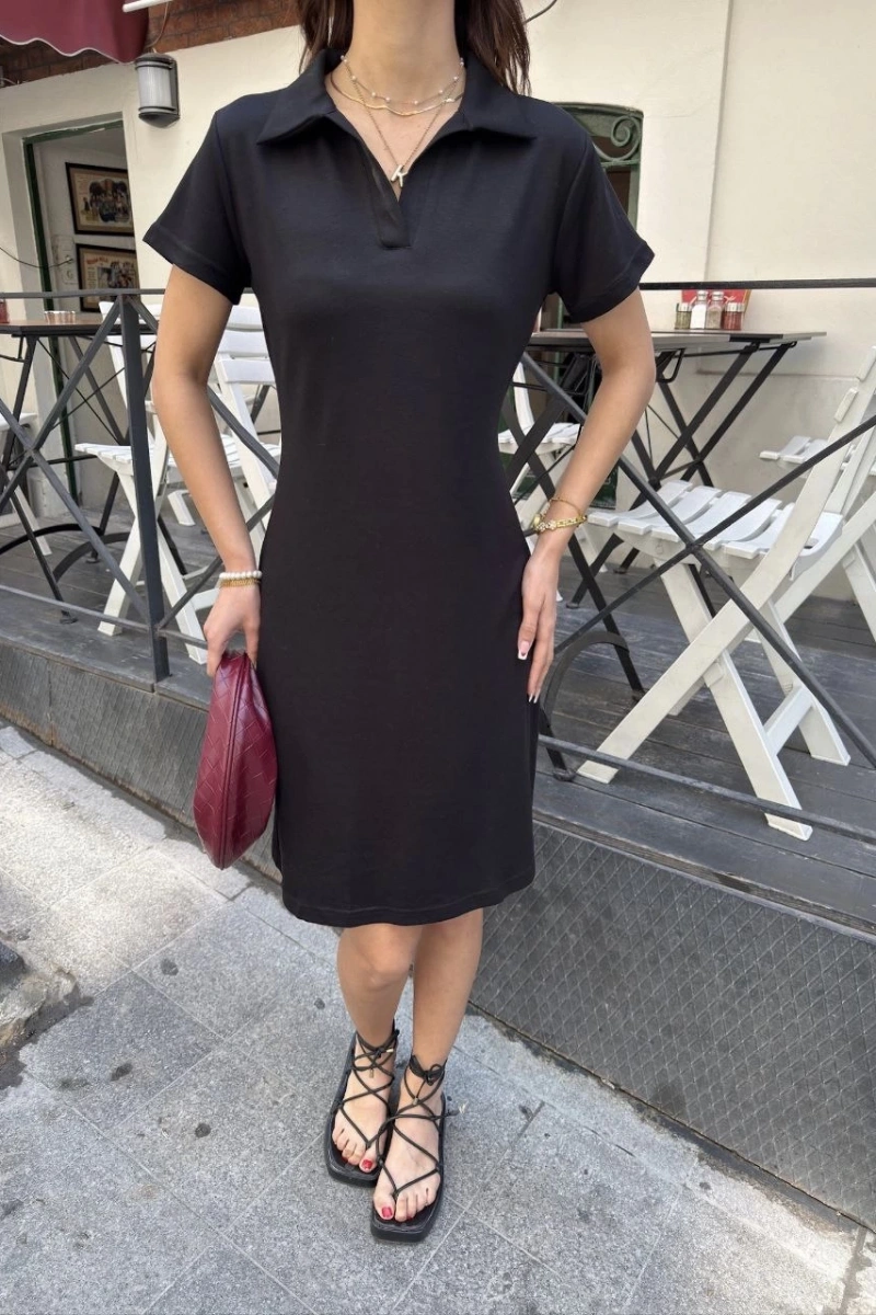 Osy Modal Yumuşak Dokulu Kumaş Yakalı Kısa Kollu Elbise - Siyah