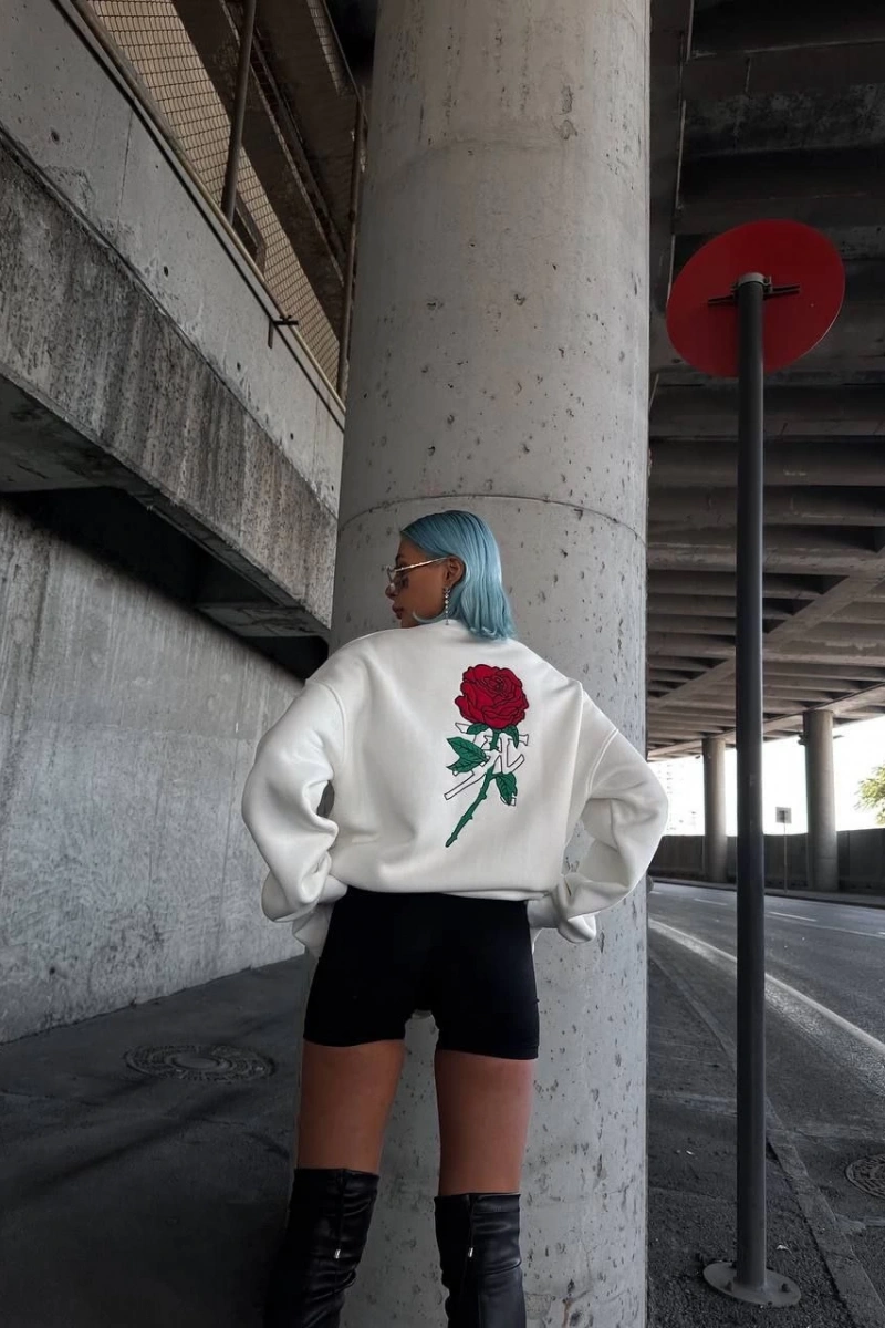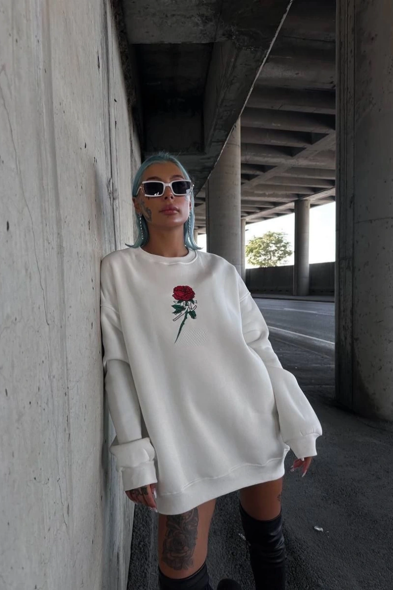Oversize Üç İplik Bisiklet Yaka Baskılı SweatShirt - Beyaz