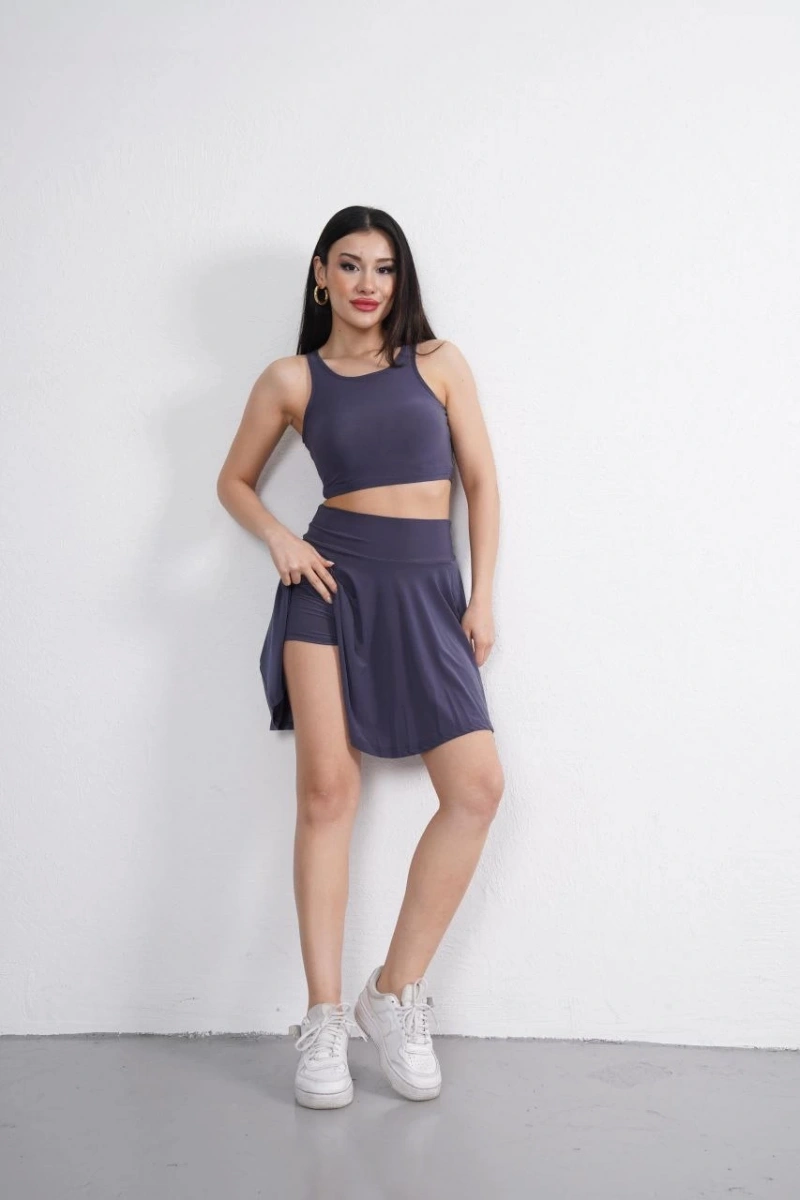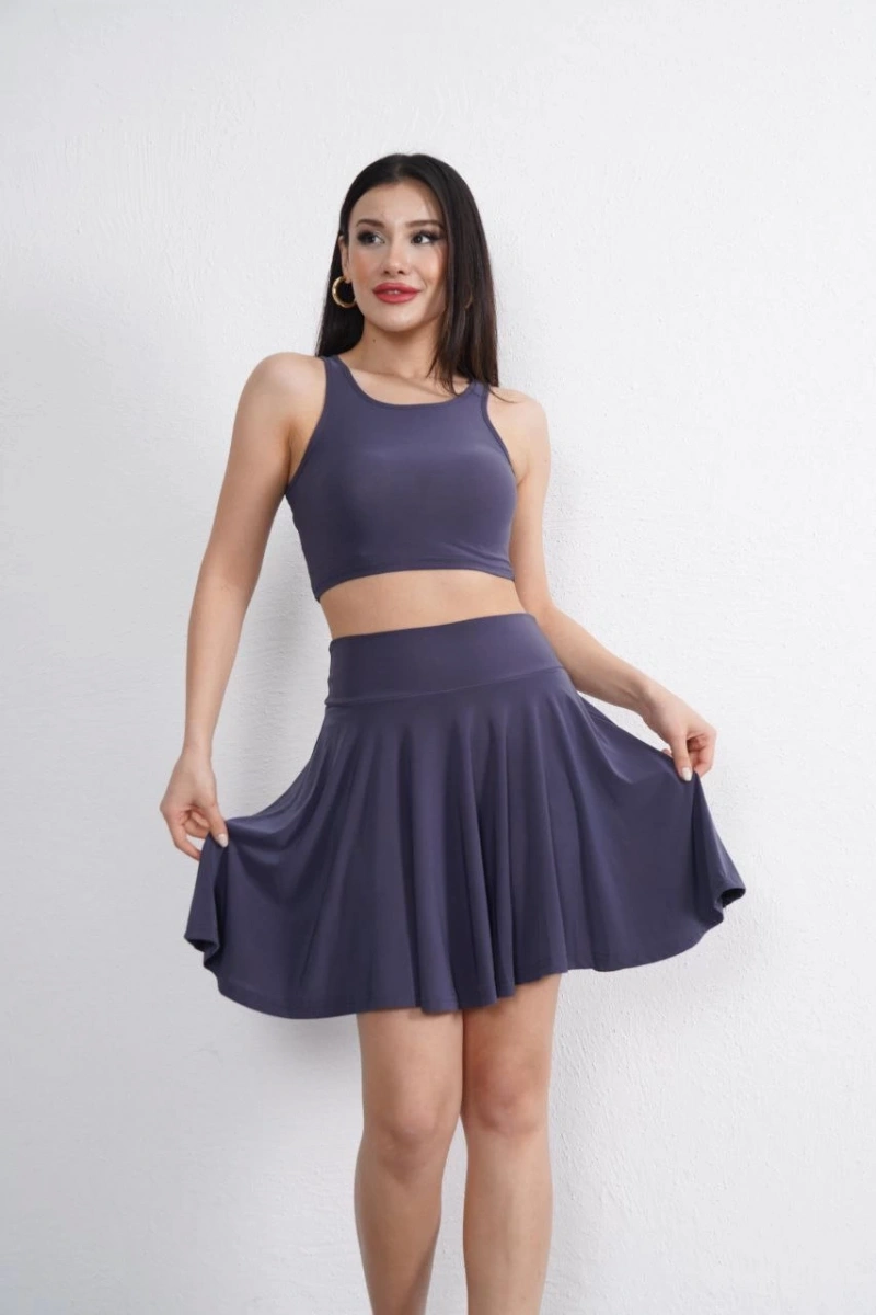 Sendy Kumaş Bisiklet Yaka Crop Şortlu Etek ikili Takım - Antrasit