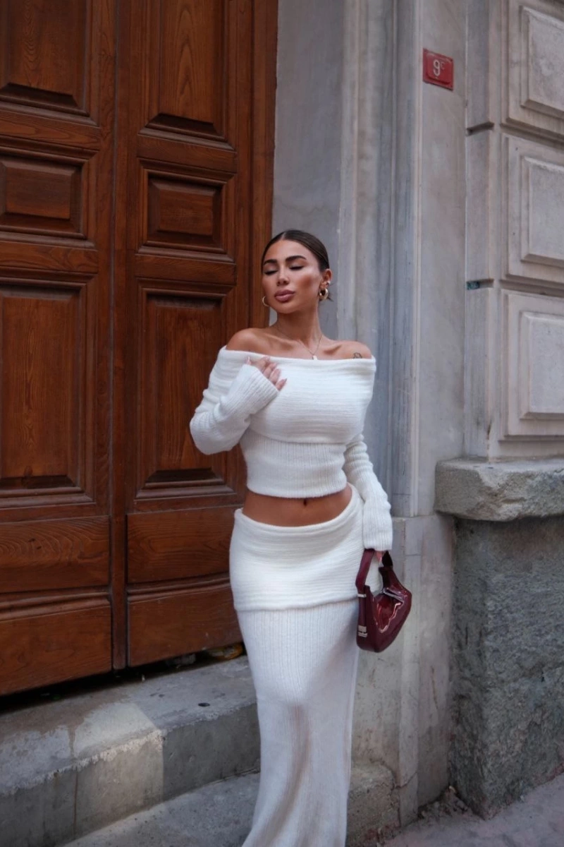 Straplez , Madonna , Carmen Yaka Croplu Uzun Etekli ikili Takım Triko - Beyaz