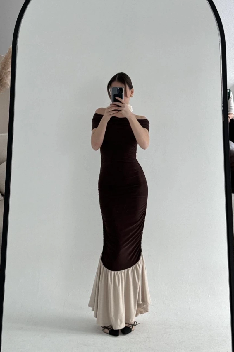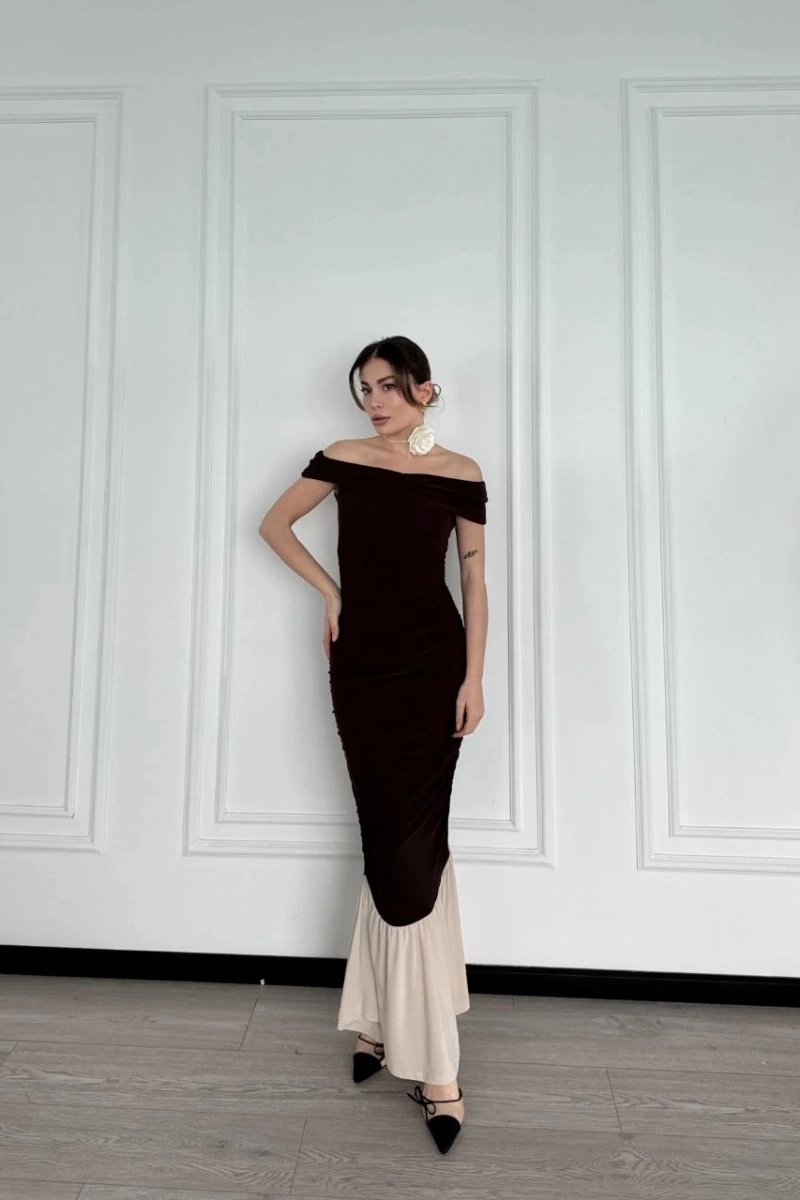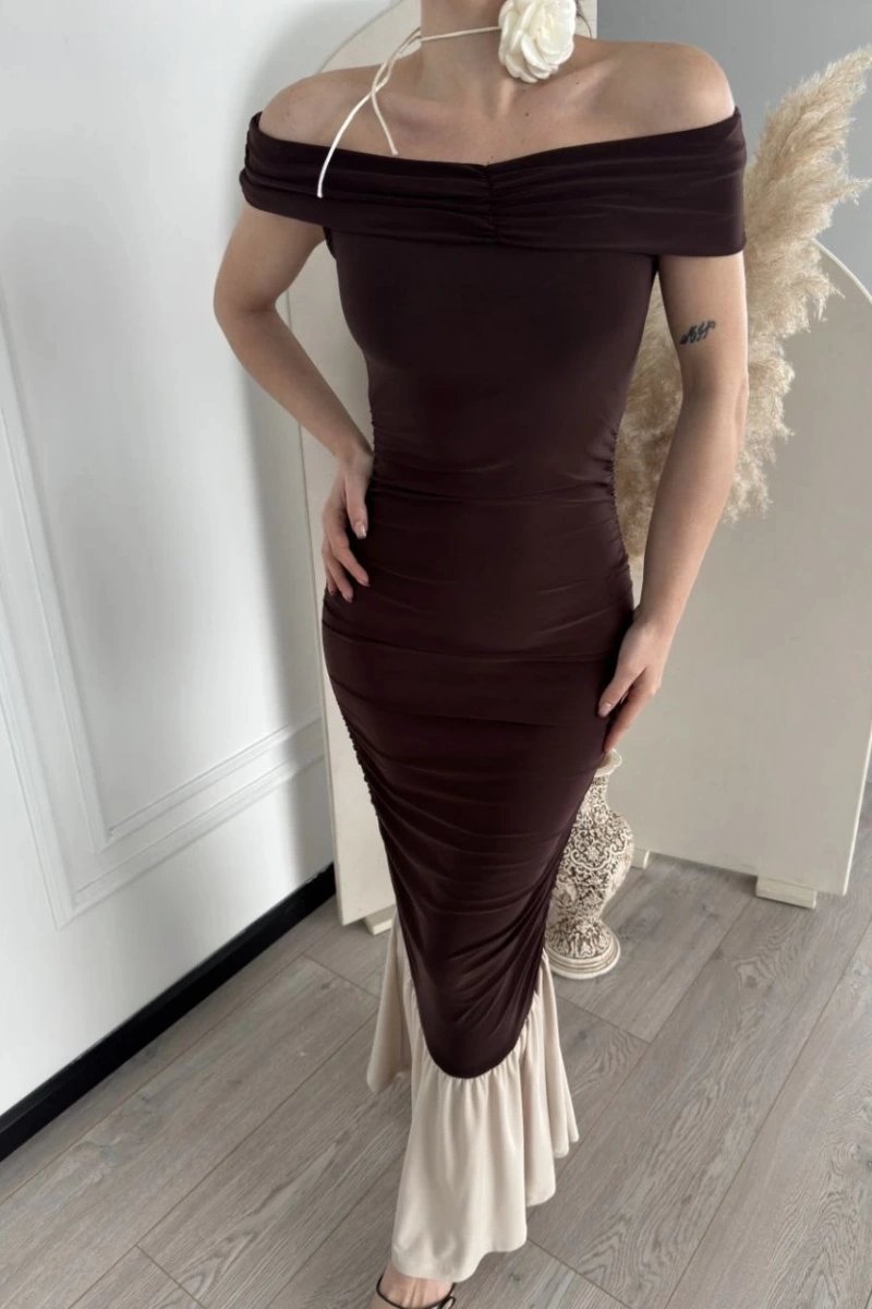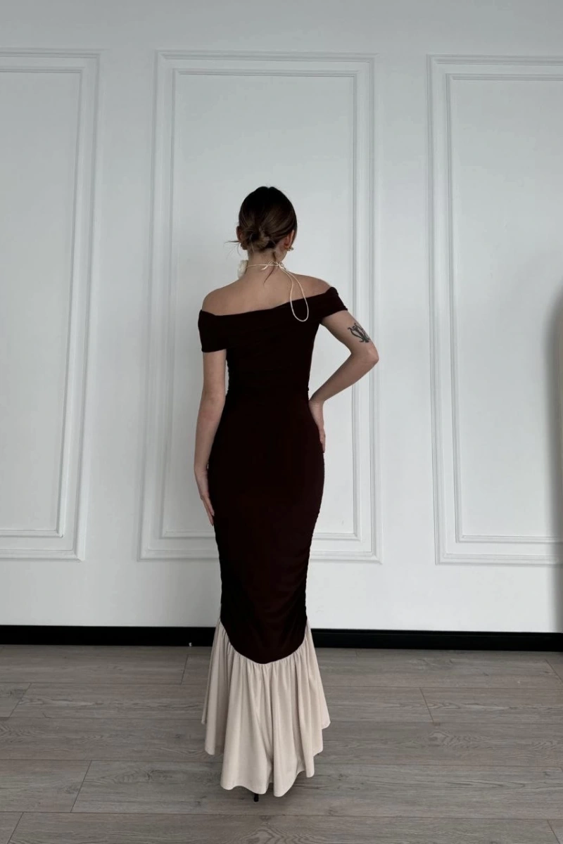 Striptiz Omuzlu Uzun Elbise- Kahve