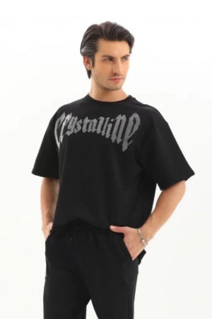 Unisex Oversize Taşlı T-Shirt - Siyah