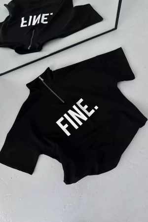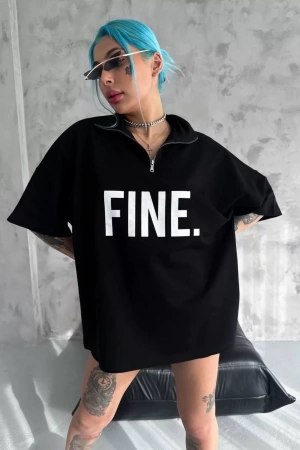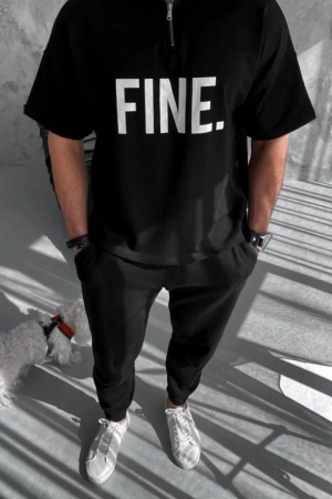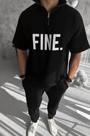 Unisex Baskılı Yarım Fermuarlı T-Shirt - Siyah