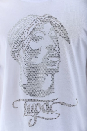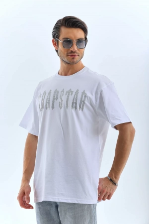 Unisex Oversize Taşlı Bisiklet Yaka T-Shirt - Beyaz