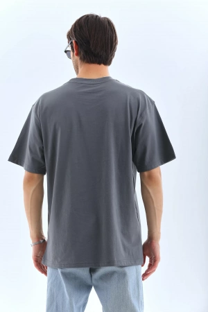 Unisex Oversize Taşlı Bisiklet Yaka T-Shirt - Füme