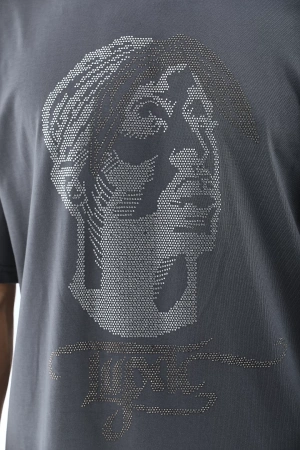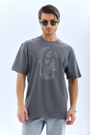 Unisex Oversize Taşlı Bisiklet Yaka T-Shirt - Gri