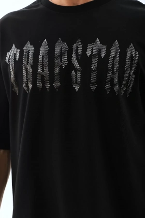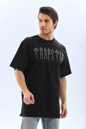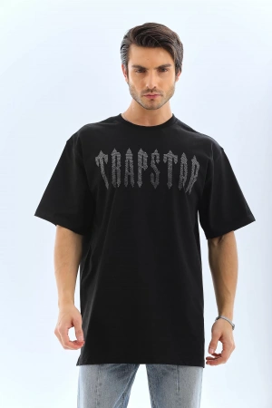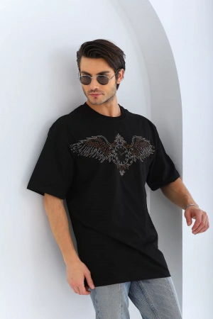 Unisex Oversize Taşlı Bisiklet Yaka T-Shirt - Siyah
