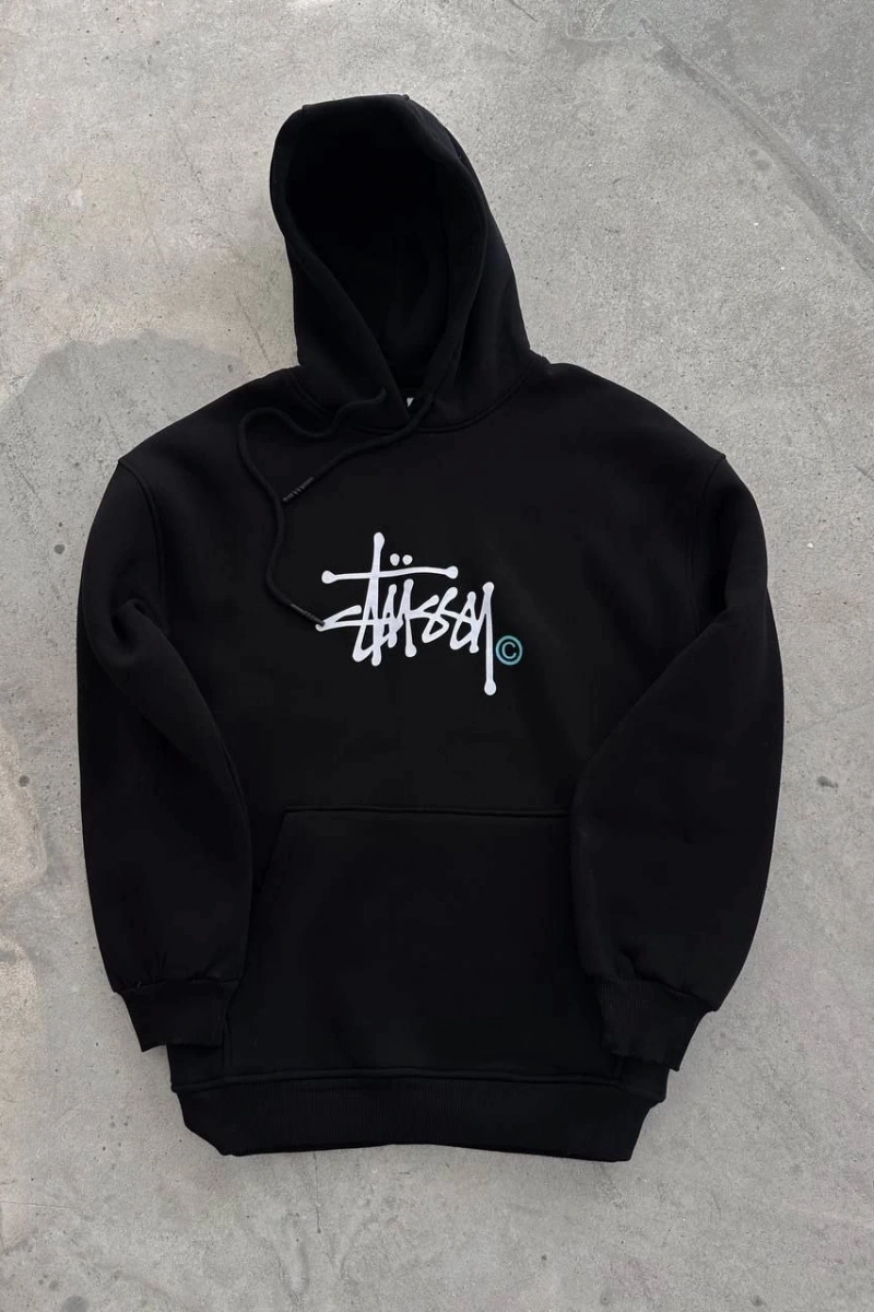Üç İplik Kapşonlu Baskılı SweatShirt - Siyah