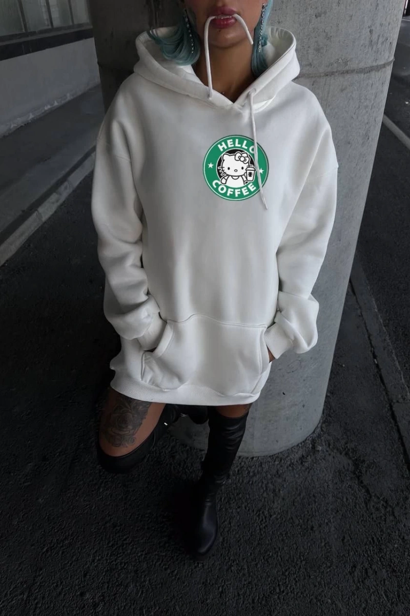 Üç İplik Penye Uzun Kol Kapüşonlu SweatShirt - Beyaz