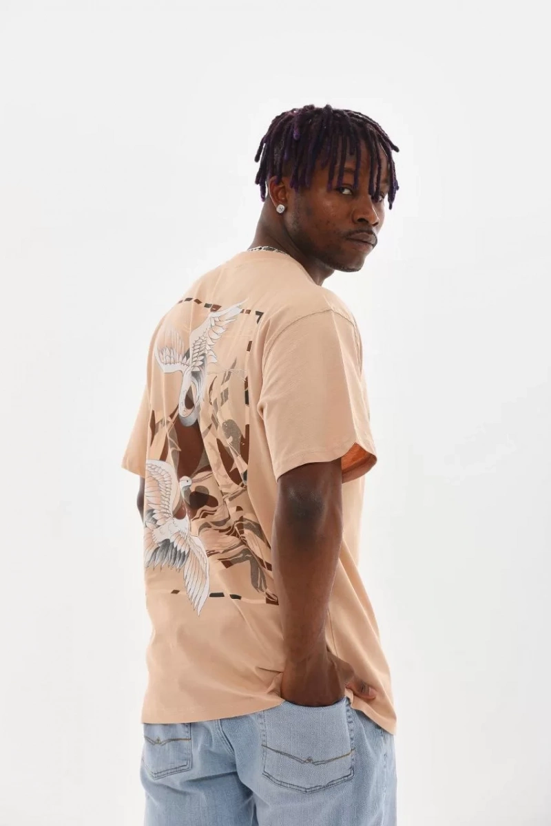 Unisex Baskılı Oversize T-Shirt - Bej