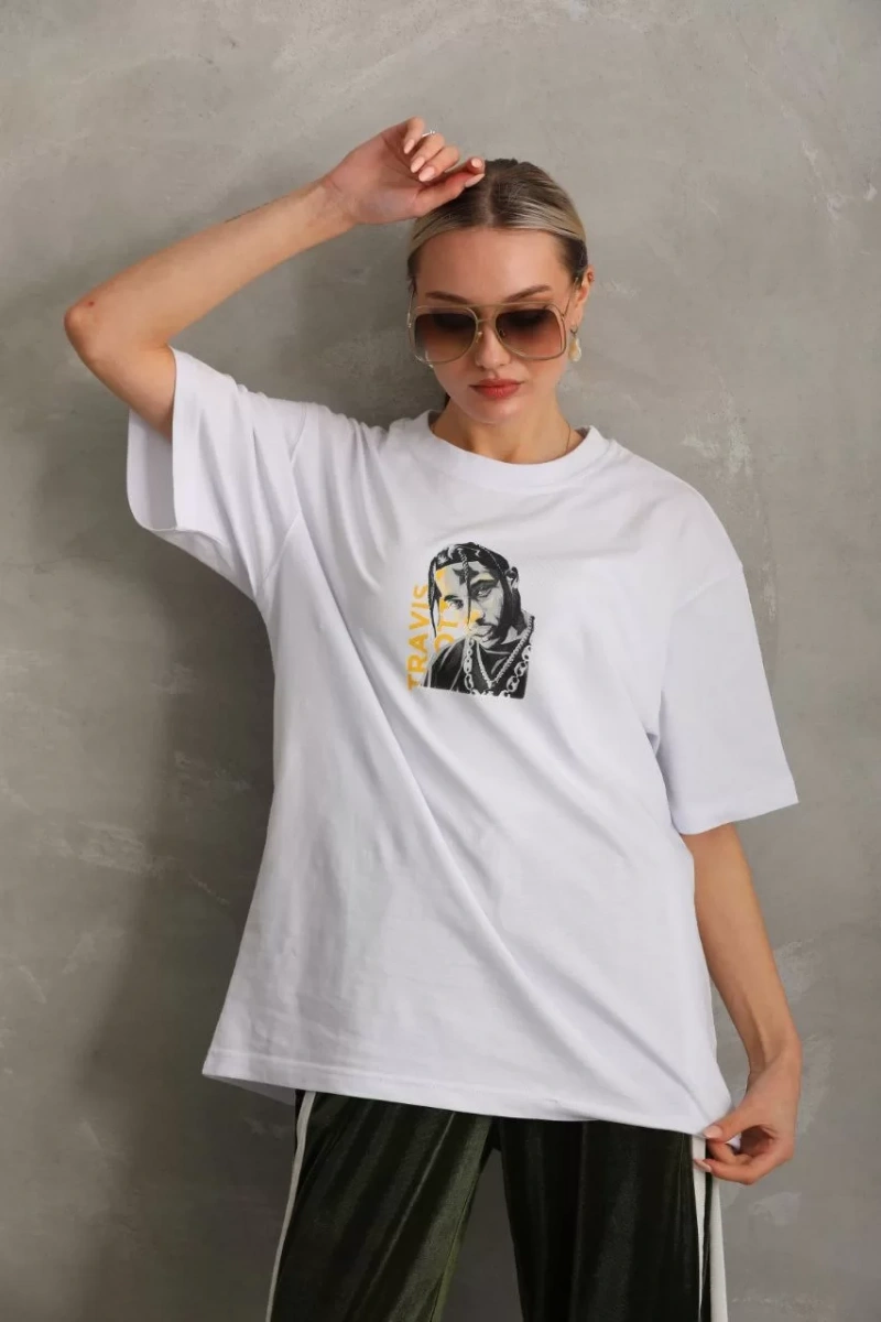 Unisex Baskılı Oversize T-Shirt - Beyaz