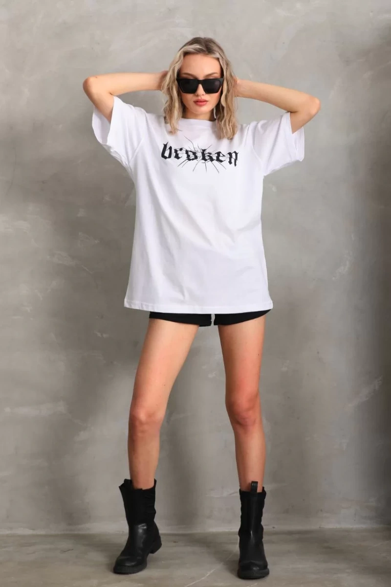 Unisex Baskılı Oversize T-Shirt - Beyaz