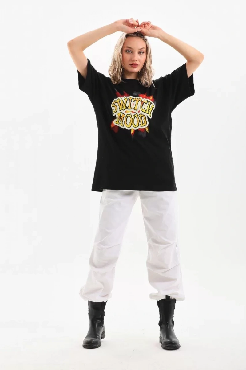 Unisex Baskılı Oversize T-Shirt - Siyah